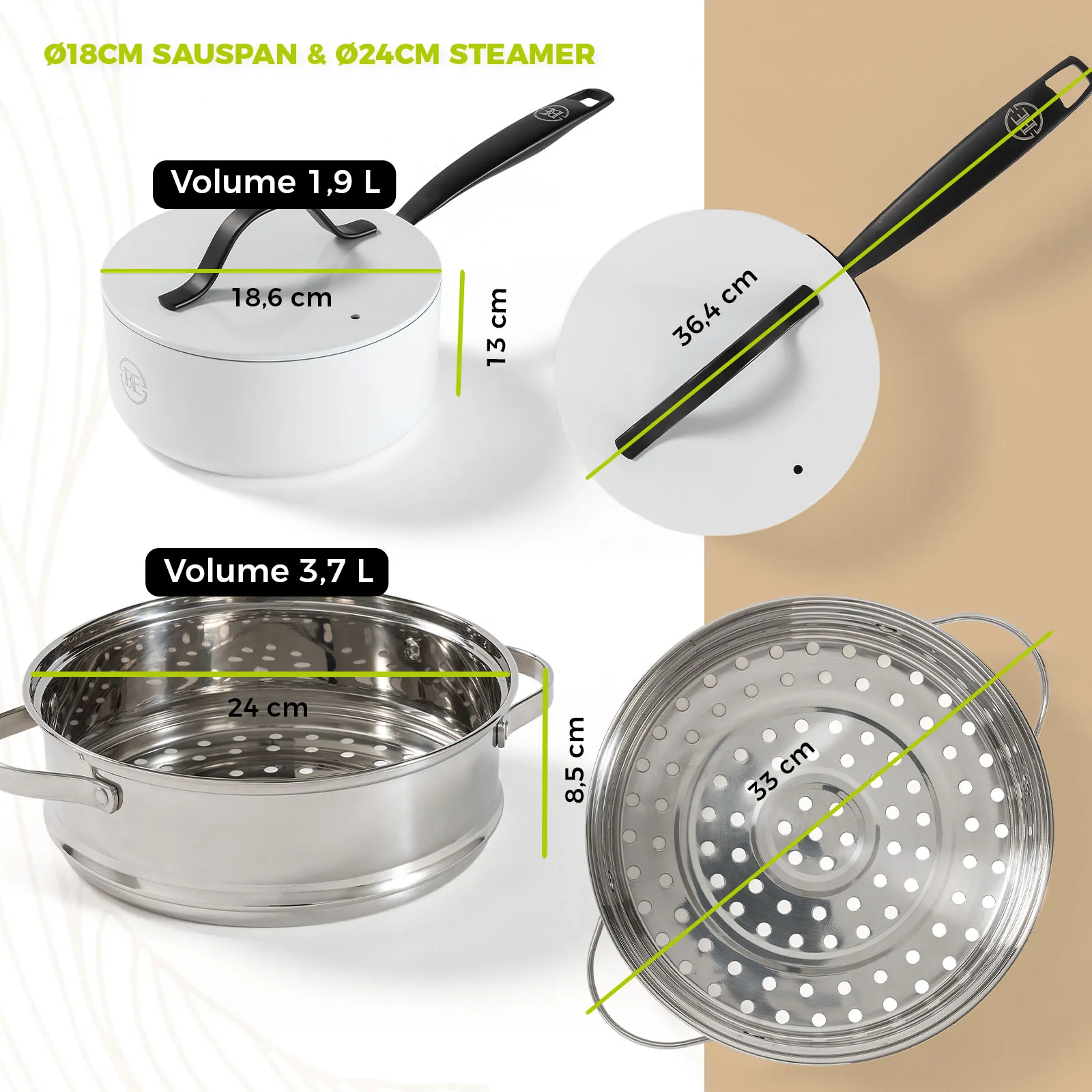 Met een keramische coating en een prachtige uitstraling is dit de ideale 6-delige pannenset met accessoires om jouw passie voor koken een upgrade te geven!
