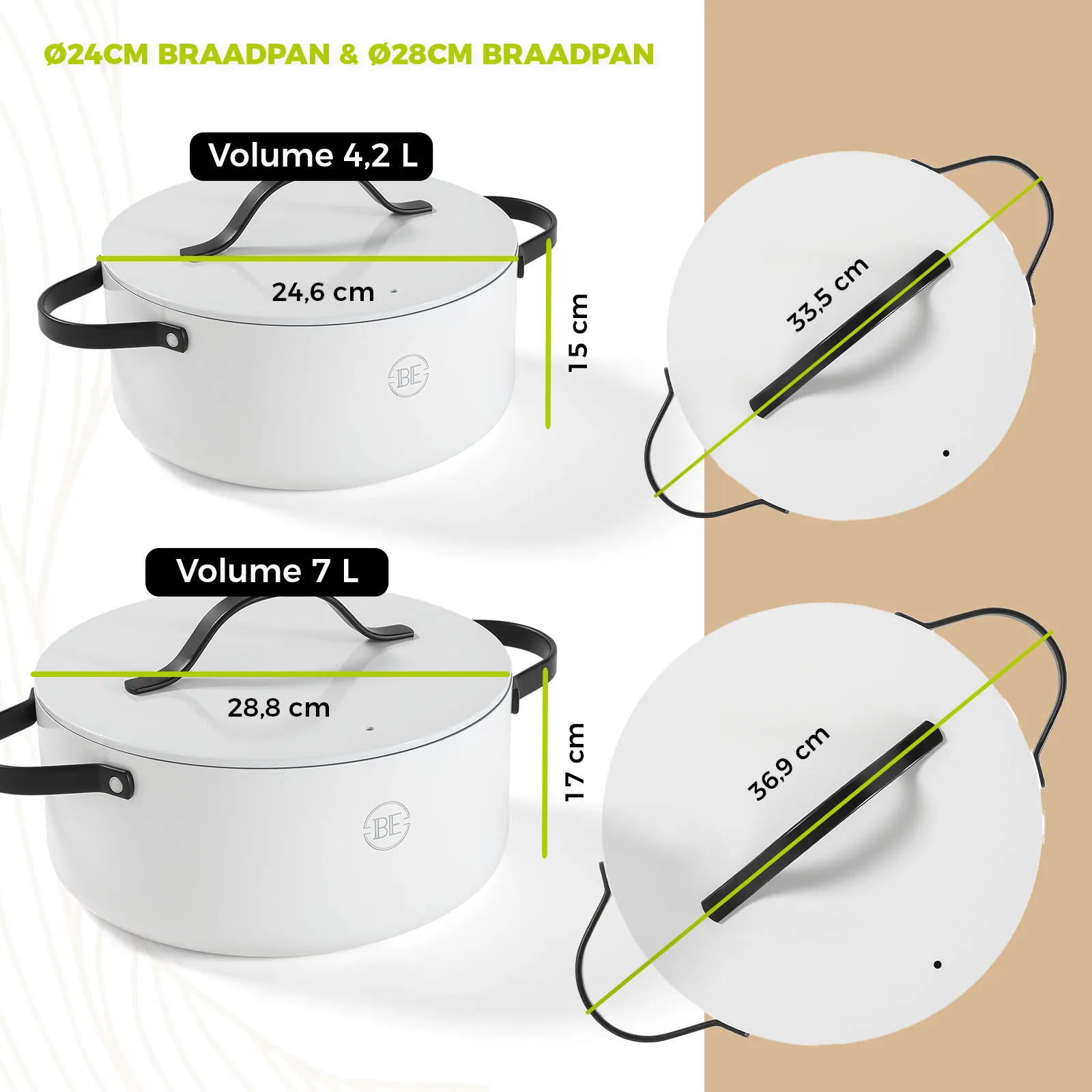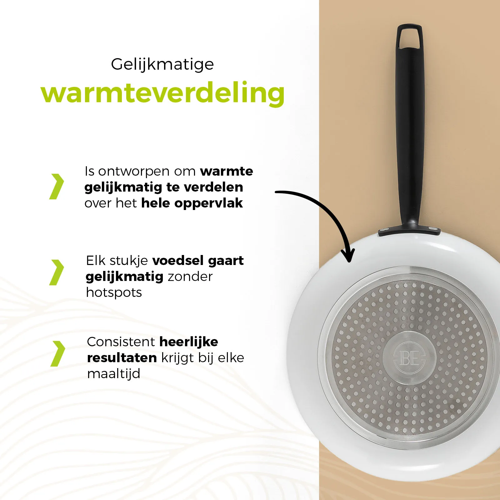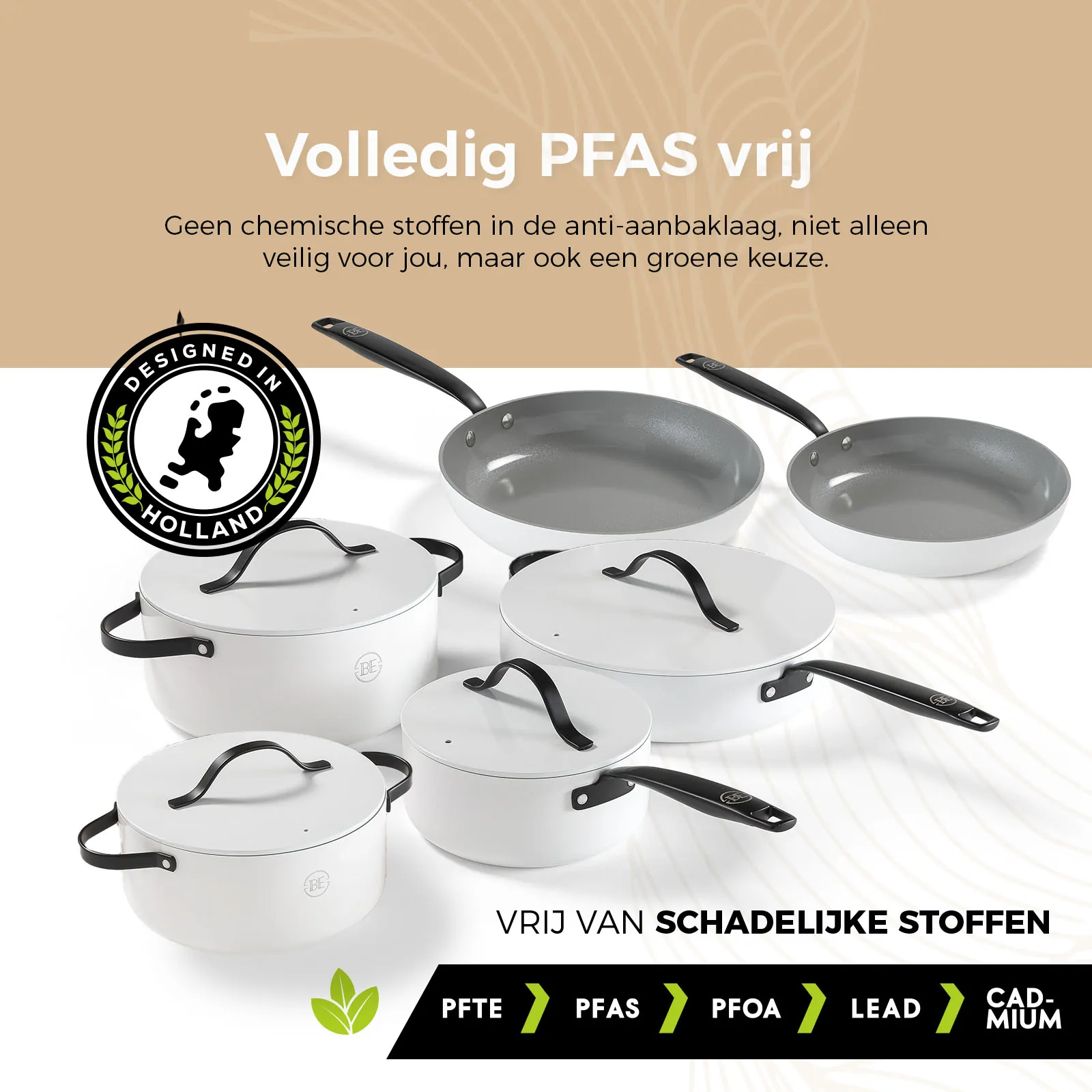 BE Living presenteert een pannenset met onder andere een witte koekenpan, braadpan en steelpan, perfect voor alle warmtebronnen inclusief inductie én vrij van PFAS. Een essentiële aanwinst voor iedere moderne keuken.