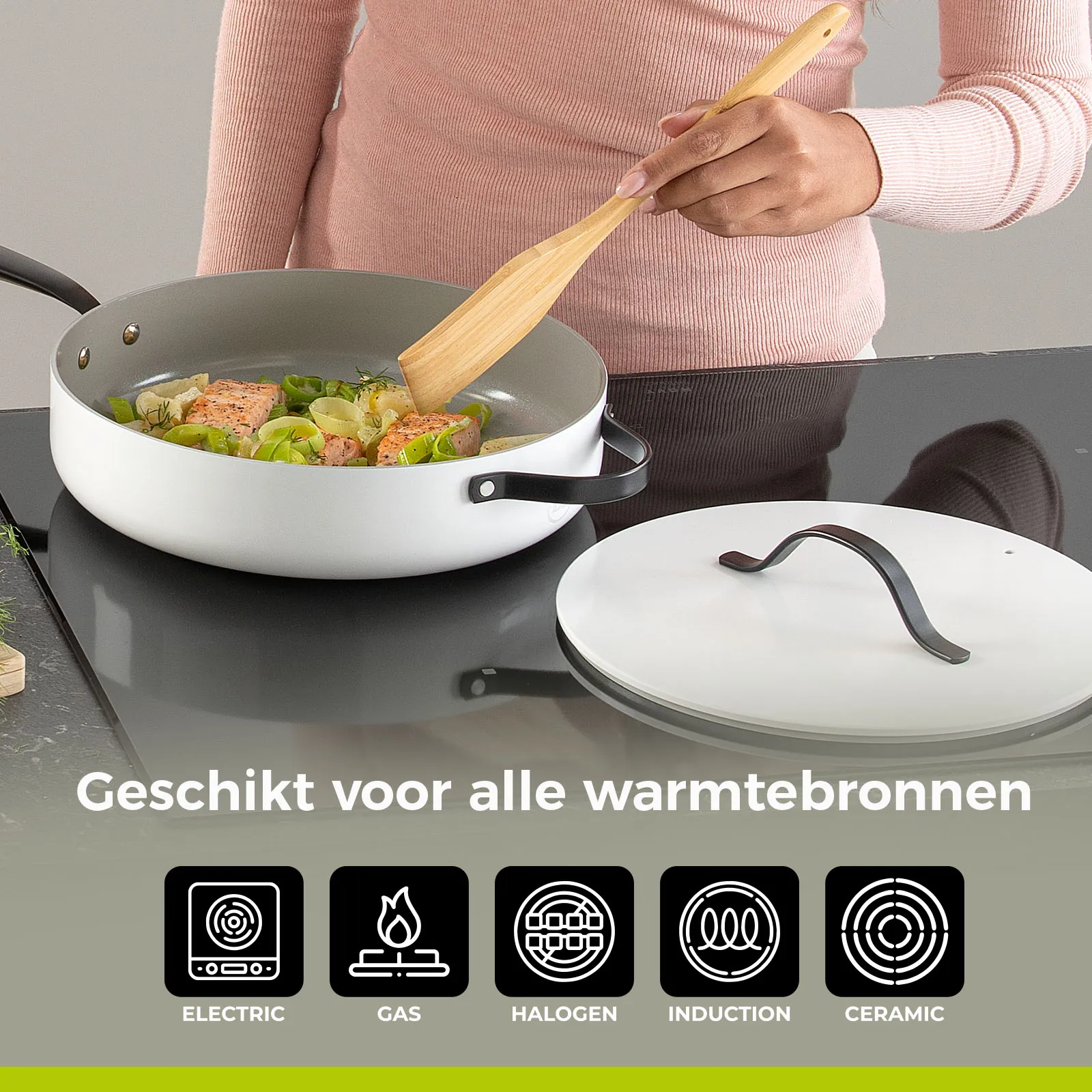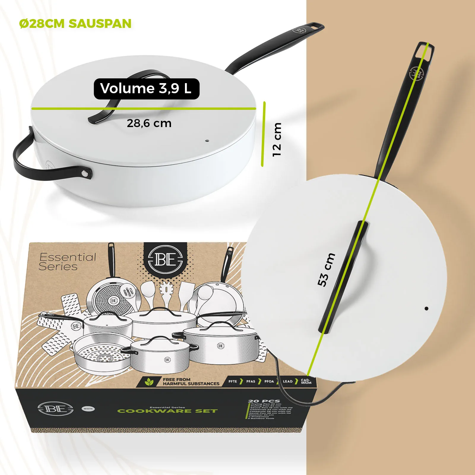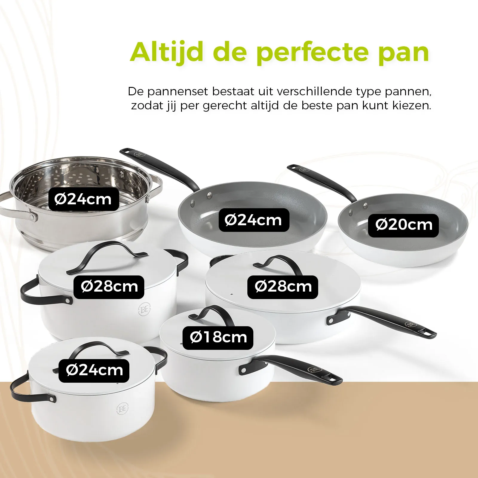 BE Living presenteert een pannenset met onder andere een witte koekenpan, braadpan en steelpan, perfect voor alle warmtebronnen inclusief inductie én vrij van PFAS. Een essentiële aanwinst voor iedere moderne keuken.