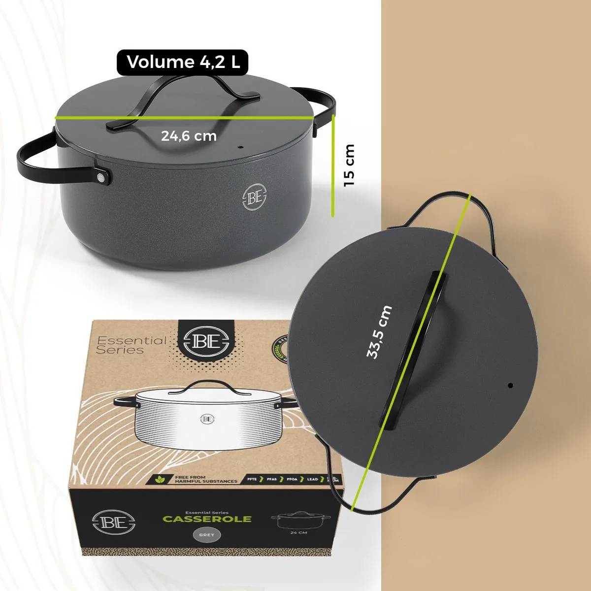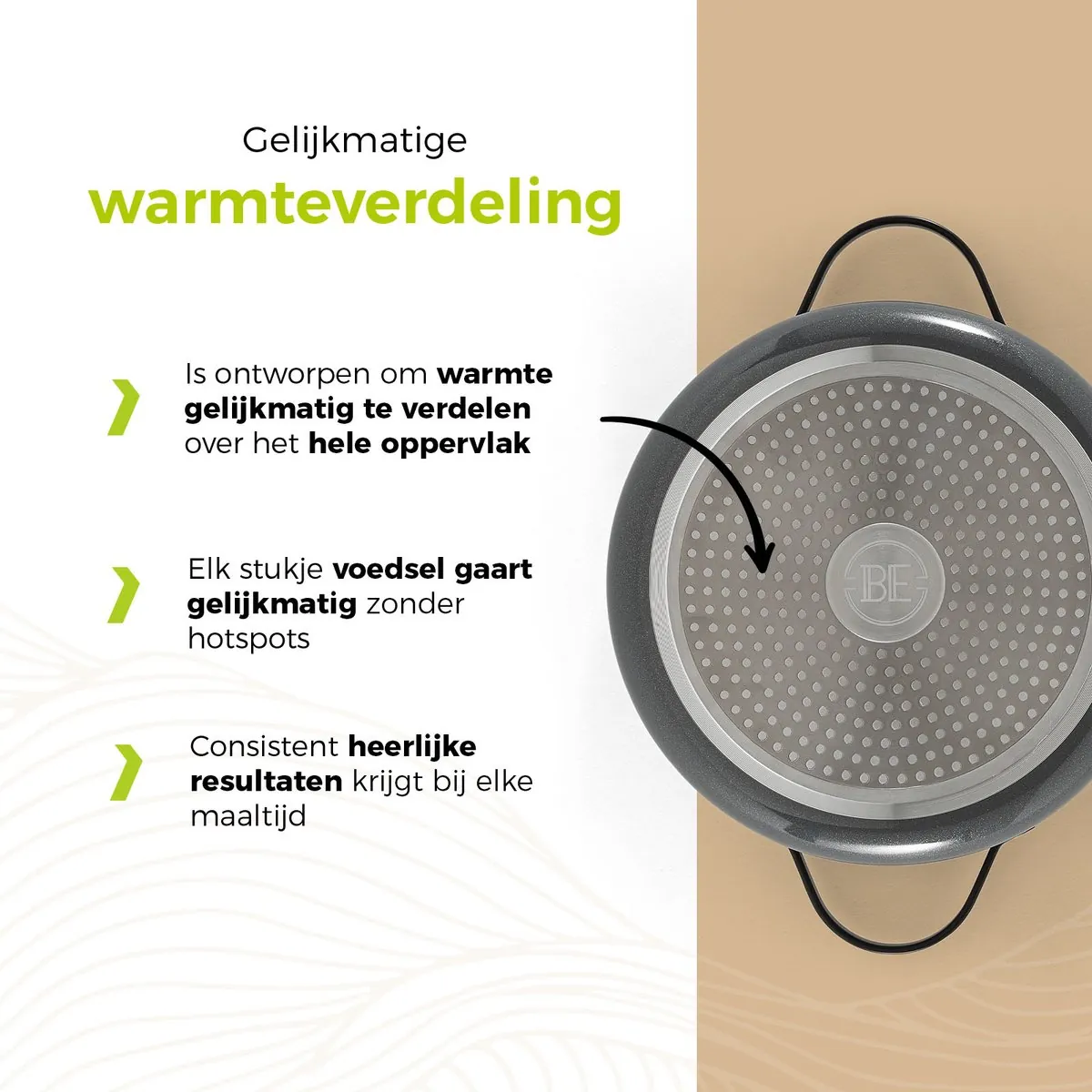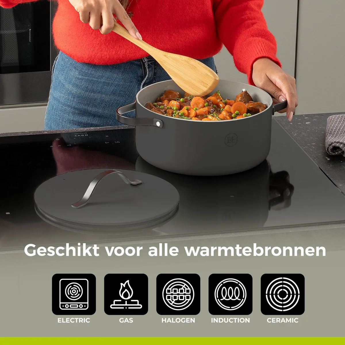 BE Living presenteert een 24 cm grijze kookpan met deksel, perfect voor alle warmtebronnen inclusief inductie én vrij van PFAS. Een essentiële aanwinst voor iedere moderne keuken.