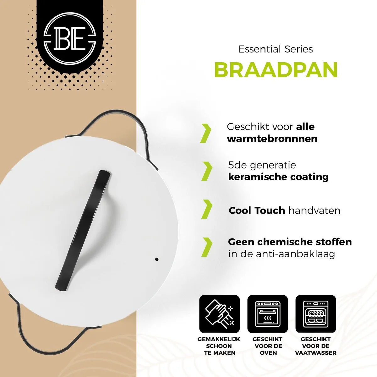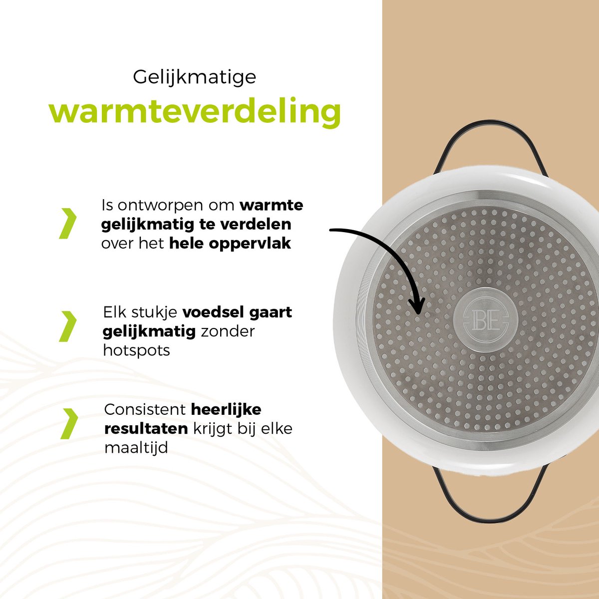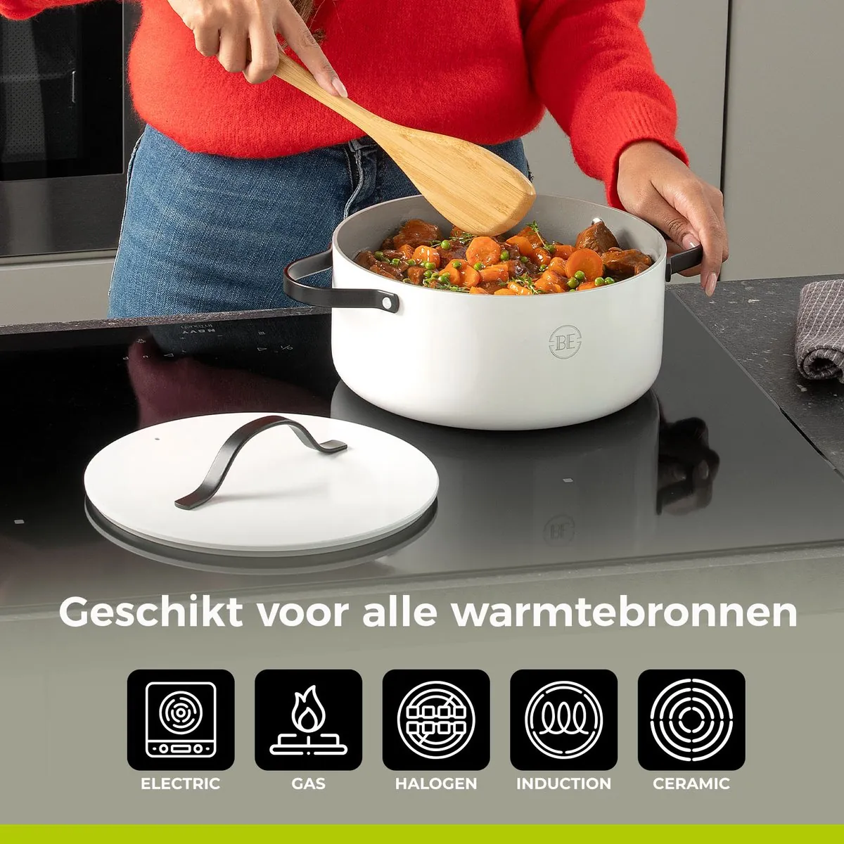 BE Living presenteert een 24 cm witte kookpan met deksel, perfect voor alle warmtebronnen inclusief inductie én vrij van PFAS. Een essentiële aanwinst voor iedere moderne keuken.