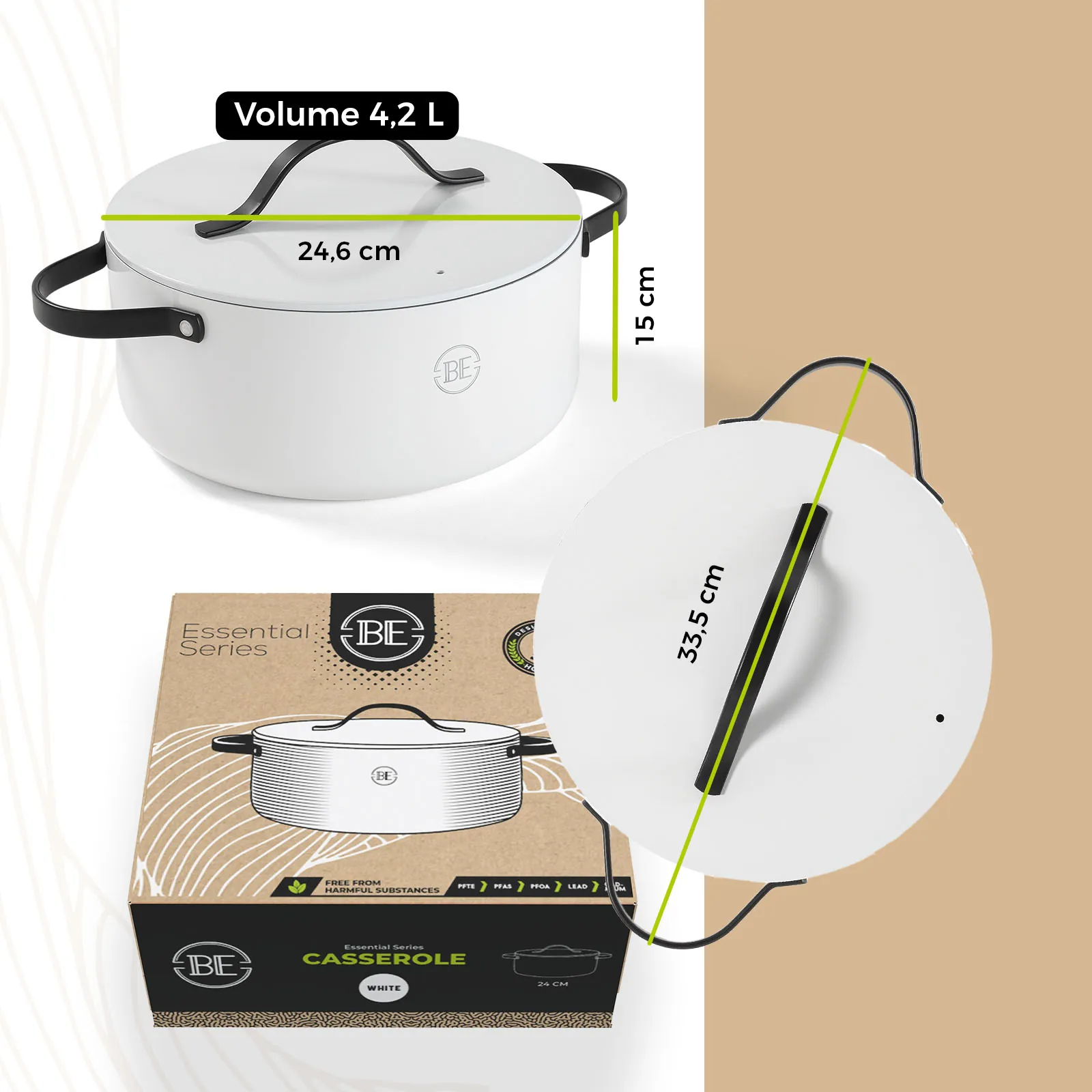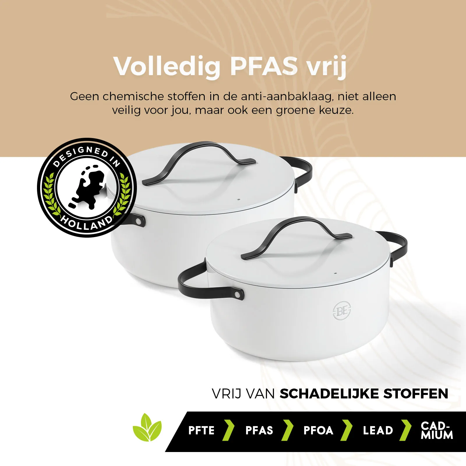 De pannen van BE Living zijn volledig vrij van PFAS, wat betekent dat je met een gerust hart kunt koken zonder schadelijke chemicaliën die in sommige anti-aanbaklagen worden aangetroffen. Dit maakt ze niet alleen veilig voor jou, maar ook een groene keuze.