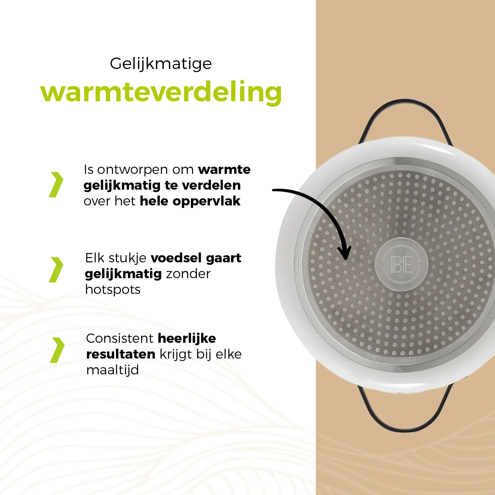 Ontdek BE Living: waar innovatie en stijl samenkomen. Onze pannen zijn ontworpen voor ultiem kookgemak op alle warmtebronnen, met een luxe design en een geavanceerde 5de graads keramische coating voor optimale anti-aanbakeigenschappen. Voorzien van cool touch handvaten en volledig PFAS-vrij, bieden wij gezonde kookoplossingen zonder compromissen op kwaliteit of veiligheid.