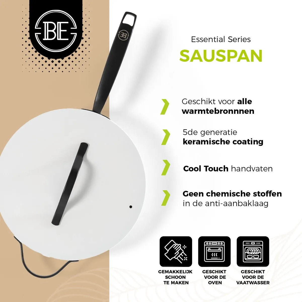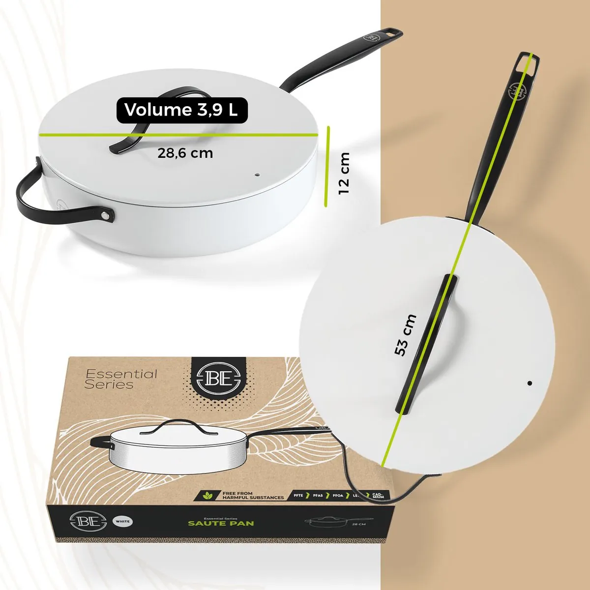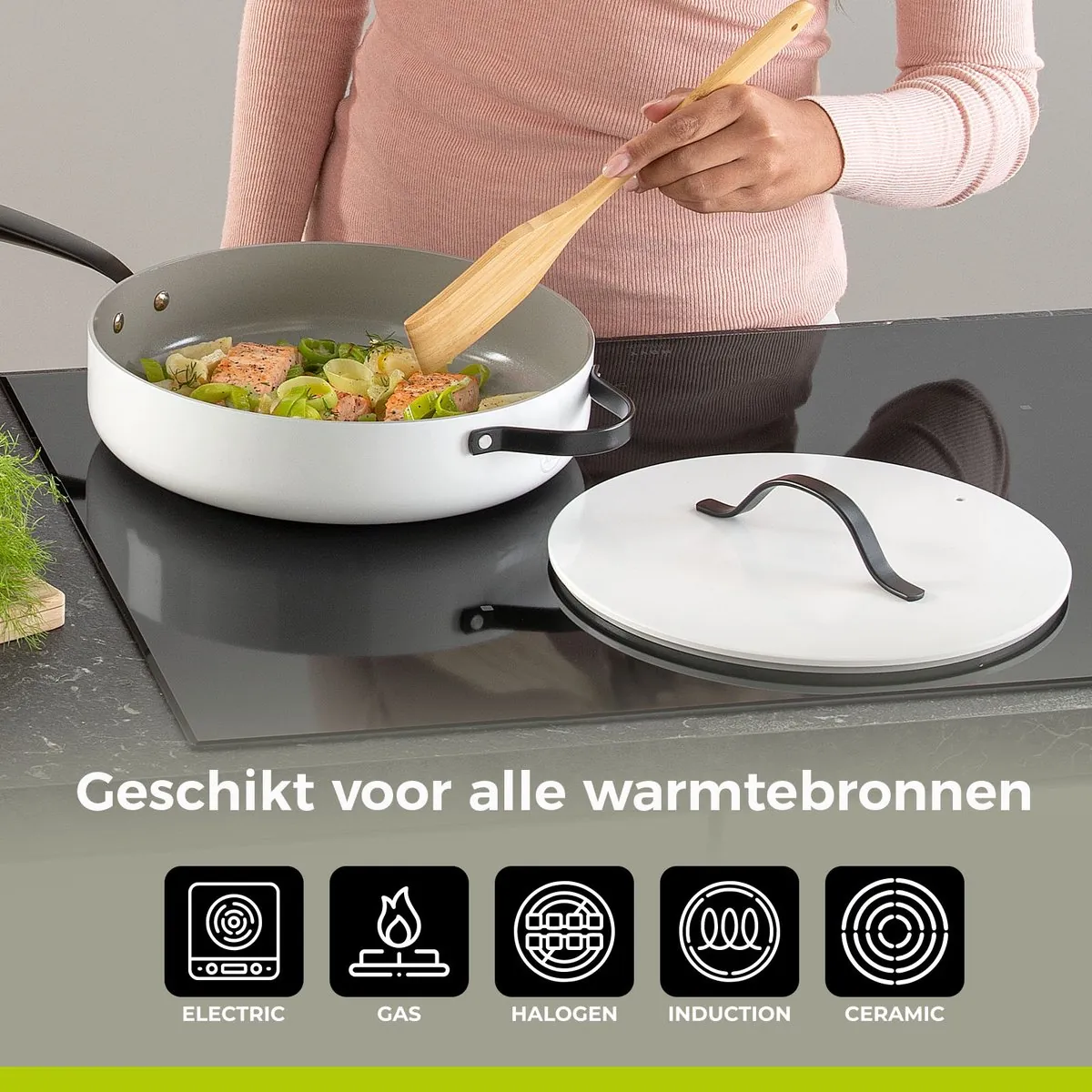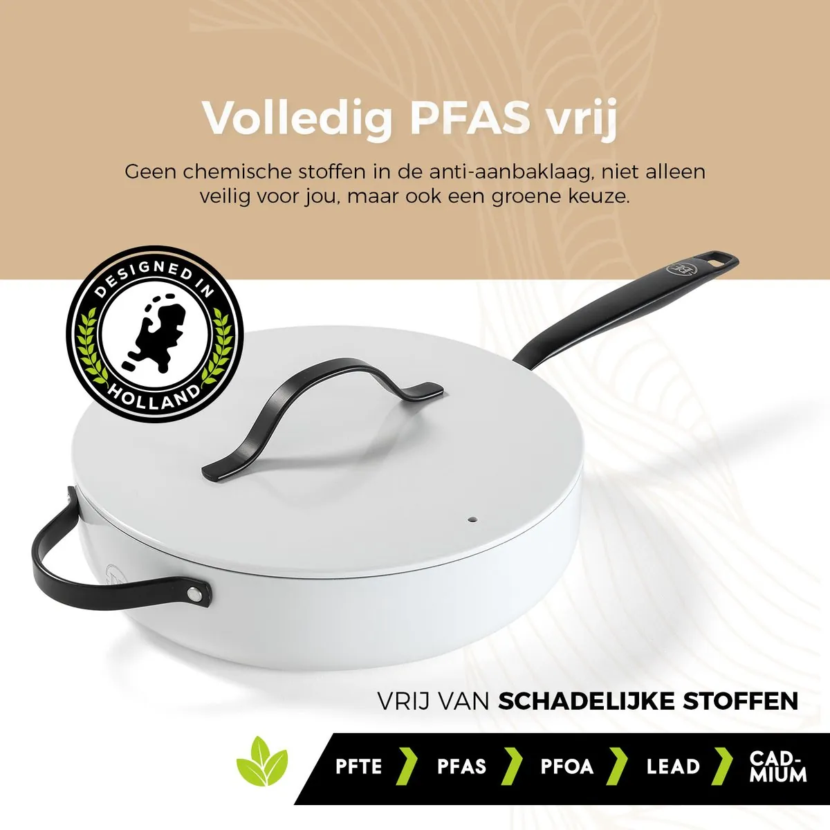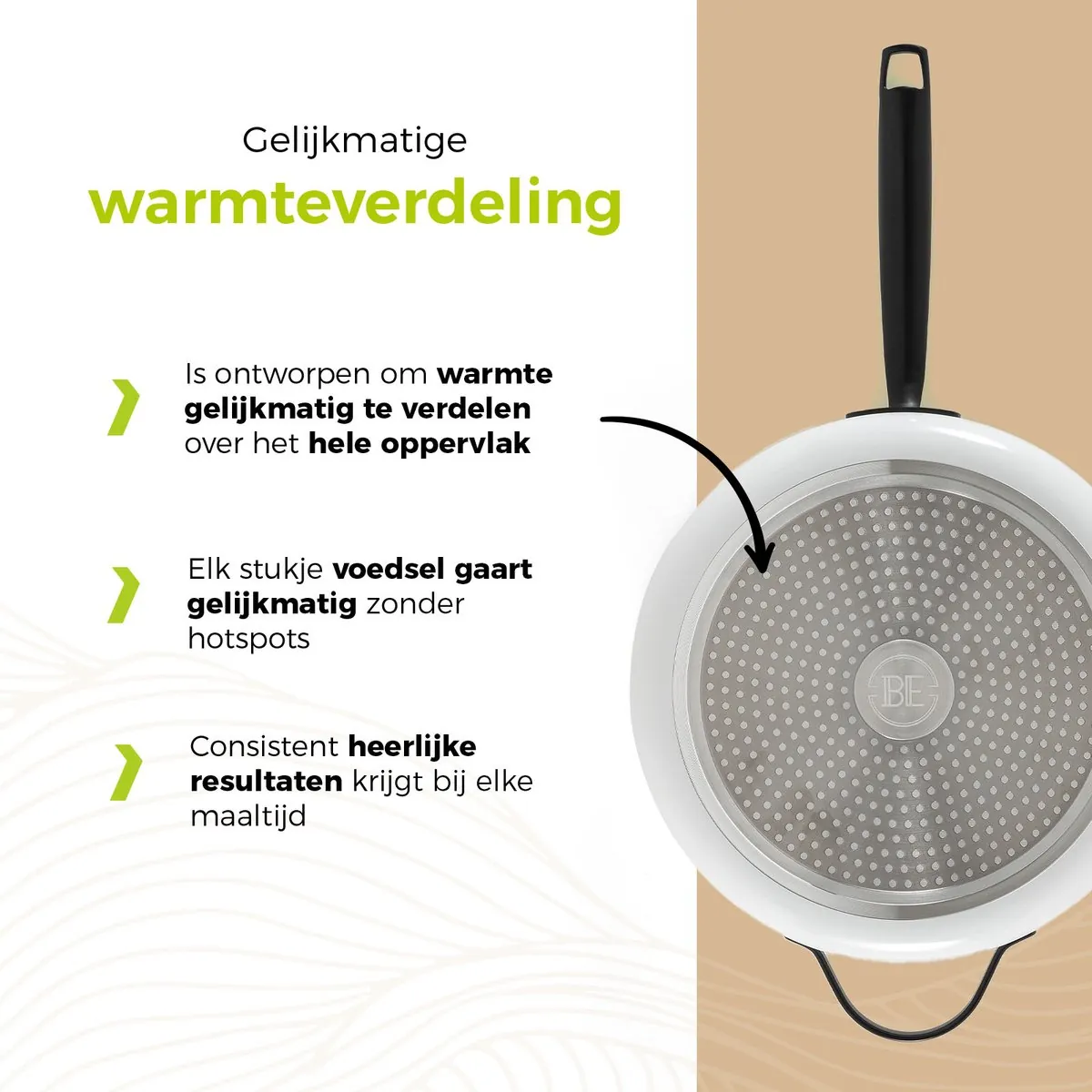 BE Living presenteert een 28 cm witte hapjespan, perfect voor alle warmtebronnen inclusief inductie én vrij van PFAS. Een essentiële aanwinst voor iedere moderne keuken.