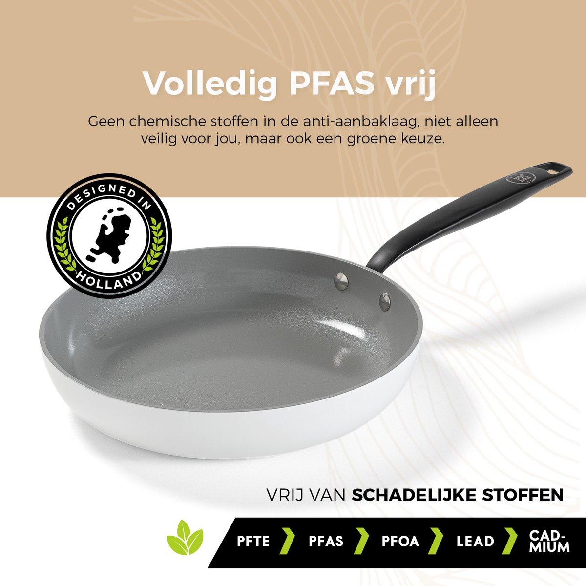 BE Living presenteert een 20 cm witte koekenpan, perfect voor alle warmtebronnen inclusief inductie én vrij van PFAS. Een essentiële aanwinst voor iedere moderne keuken.