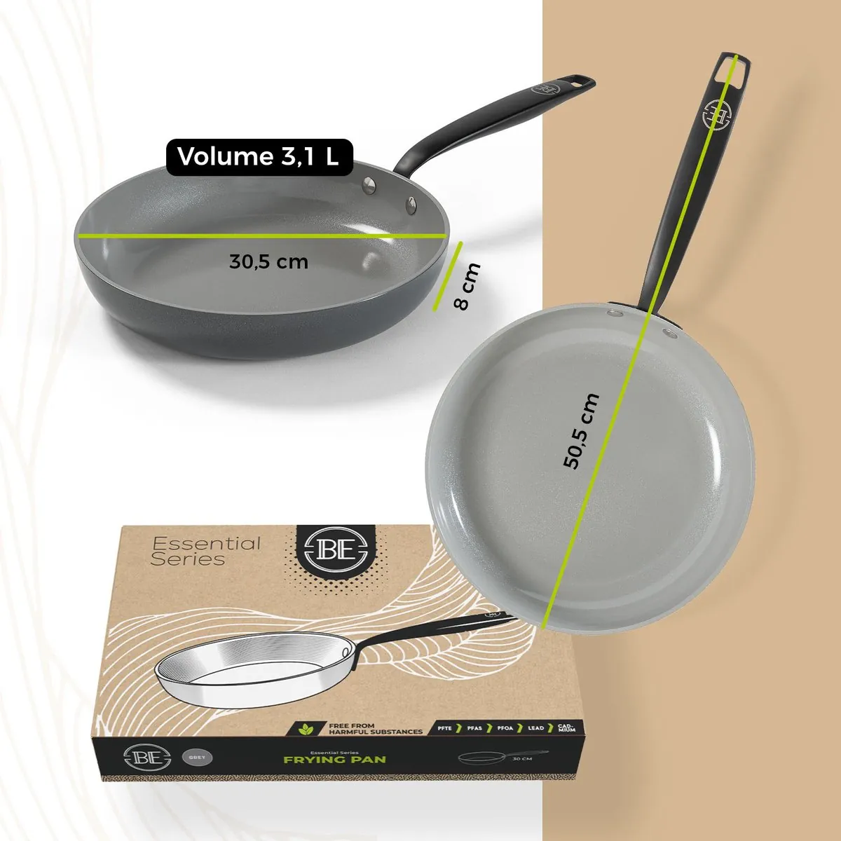 BE Living presenteert een 30 cm grijze koekenpan, perfect voor alle warmtebronnen inclusief inductie én vrij van PFAS. Een essentiële aanwinst voor iedere moderne keuken.