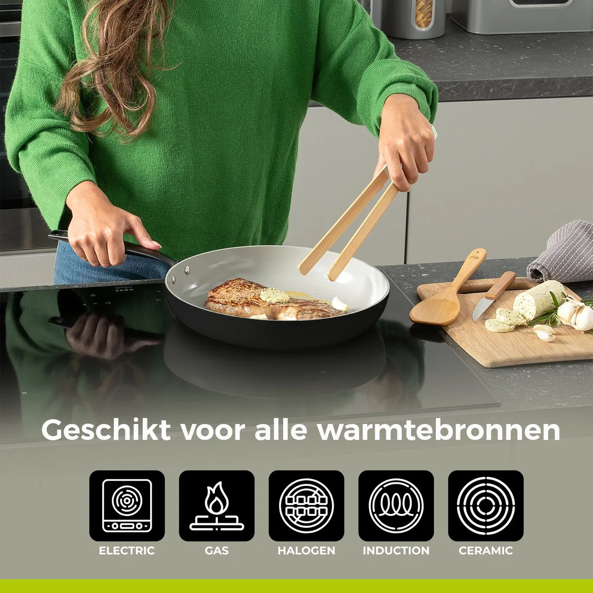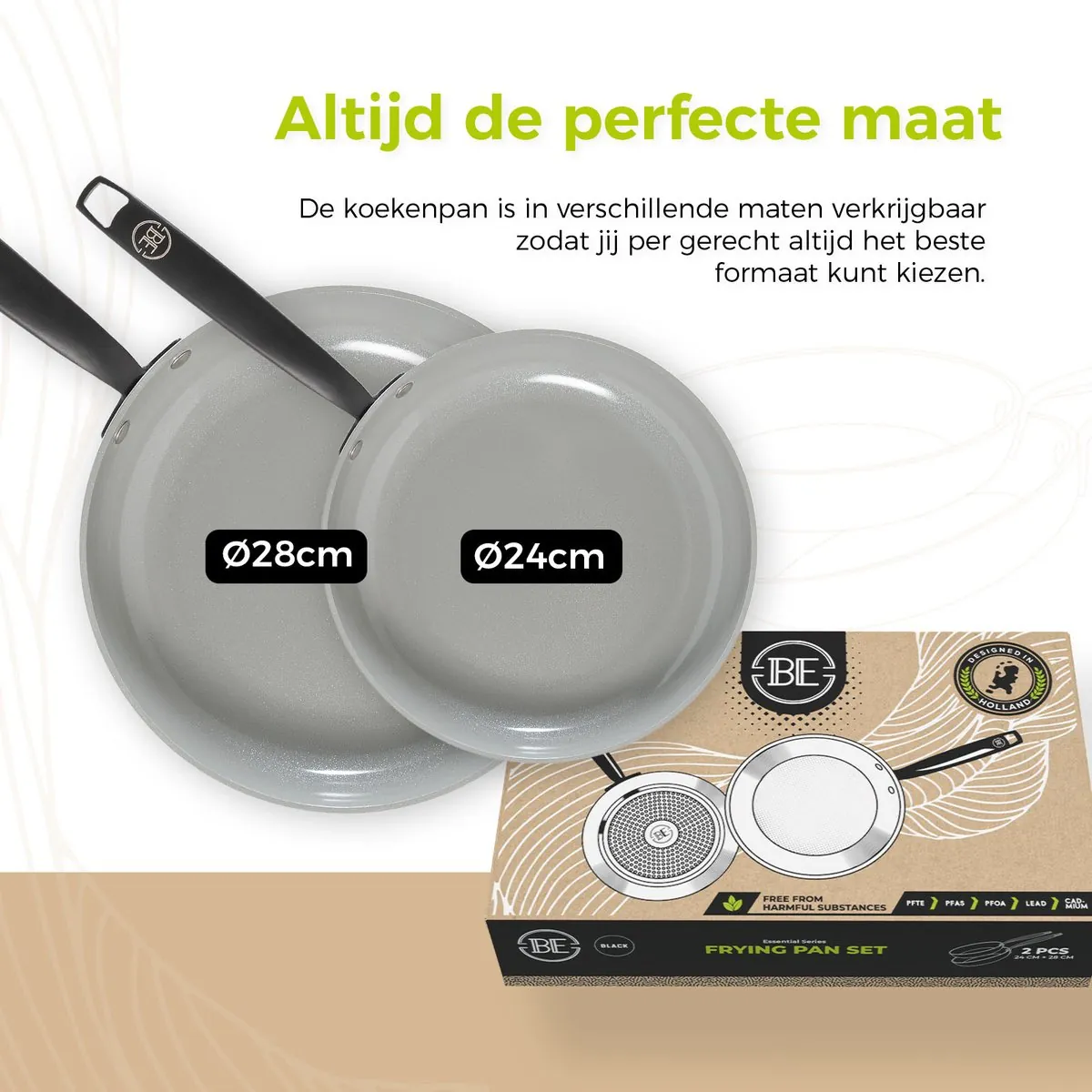BE Living presenteert een 24 en 28 cm zwarte koekenpannenset, perfect voor alle warmtebronnen inclusief inductie én vrij van PFAS. Een essentiële aanwinst voor iedere moderne keuken.