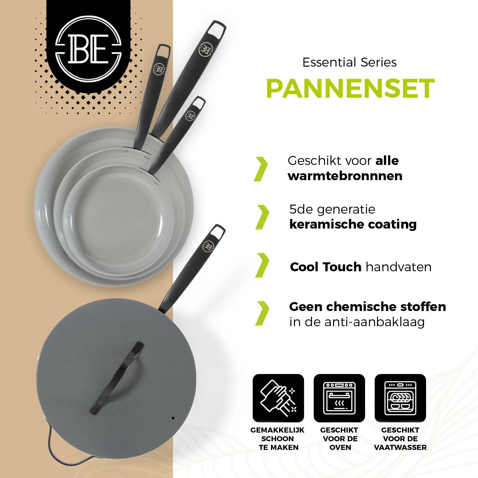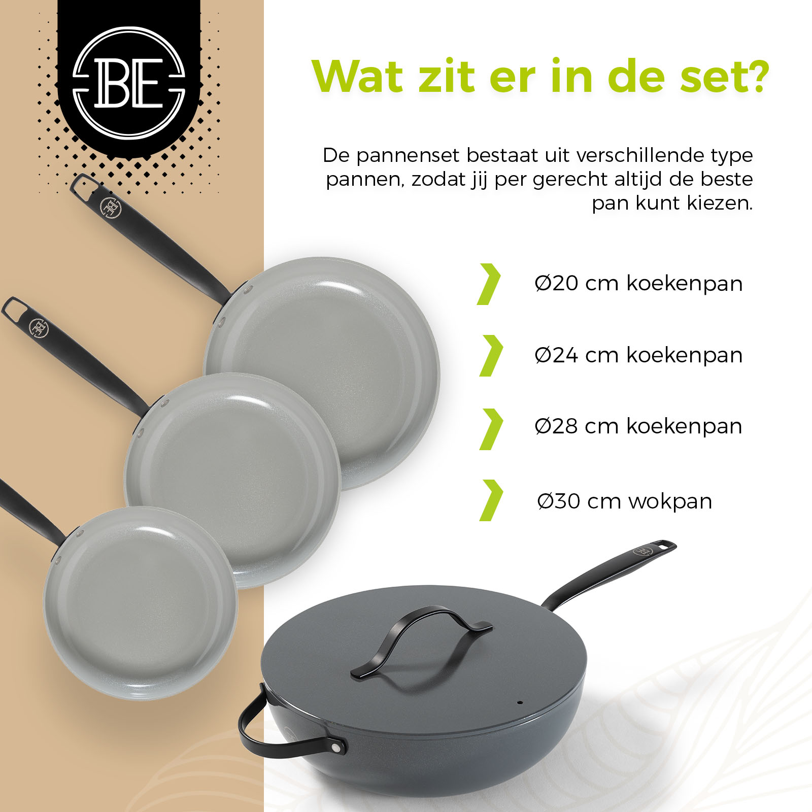 BE Living presenteert een pannenset met koekenpannen van Ø 20, 24 en 28 cm + een wokpan van Ø 30 cm, perfect voor alle warmtebronnen inclusief inductie én vrij van PFAS. Een essentiële aanwinst voor iedere moderne keuken.