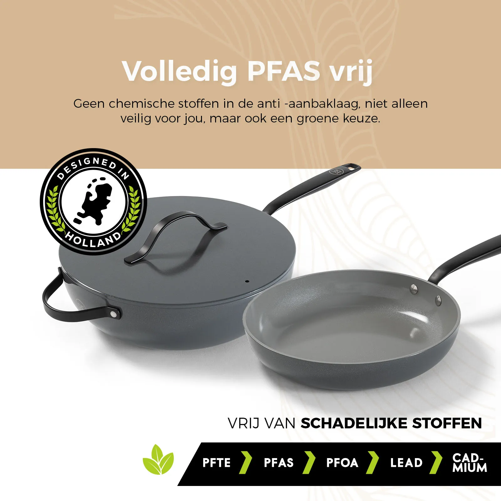 De pannen van BE Living zijn volledig vrij van PFAS, wat betekent dat je met een gerust hart kunt koken zonder schadelijke chemicaliën die in sommige anti-aanbaklagen worden aangetroffen. Dit maakt ze niet alleen veilig voor jou, maar ook een groene keuze.