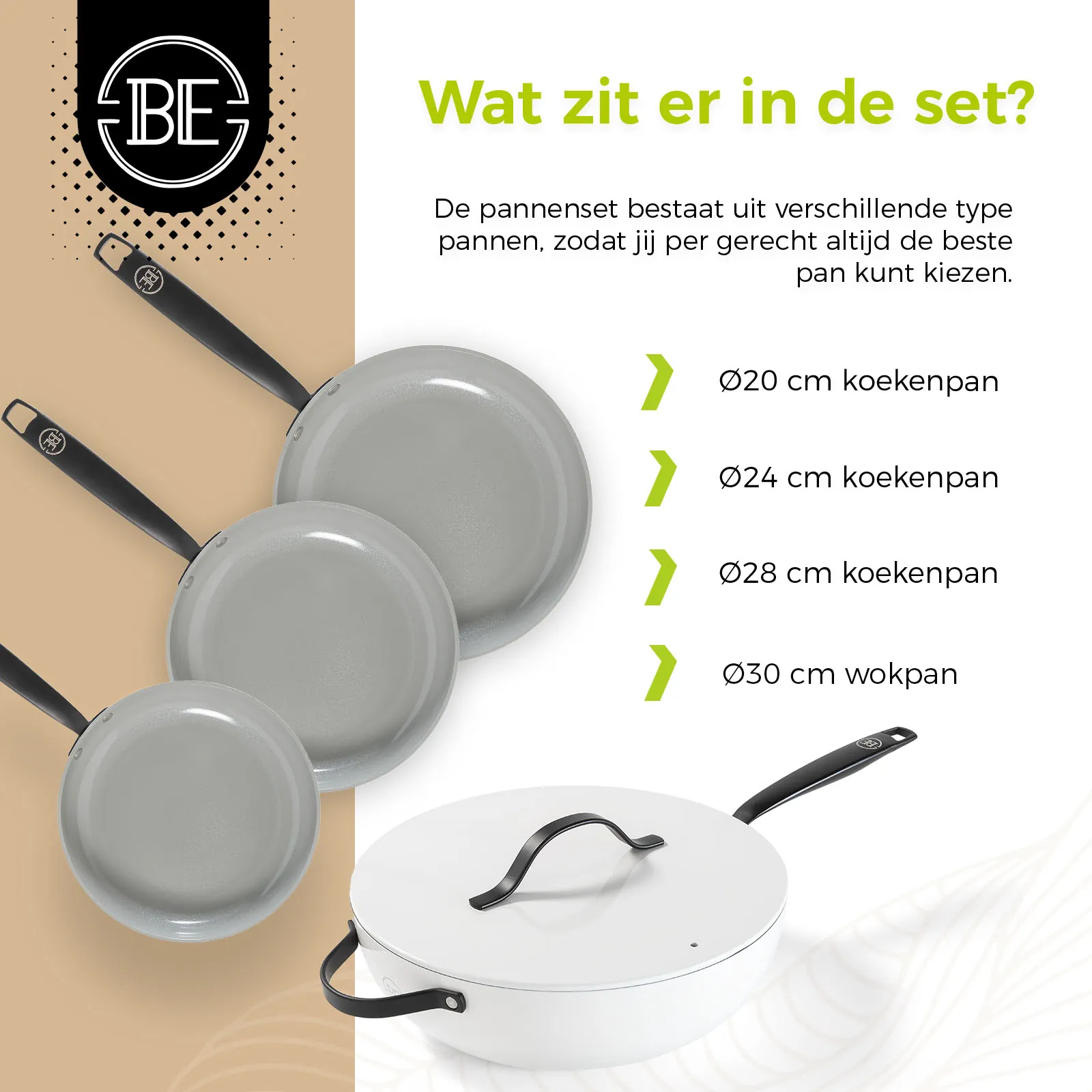 BE Living presenteert een pannenset met koekenpannen van Ø 20, 24 en 28 cm + een wokpan van Ø 30 cm, perfect voor alle warmtebronnen inclusief inductie én vrij van PFAS. Een essentiële aanwinst voor iedere moderne keuken.