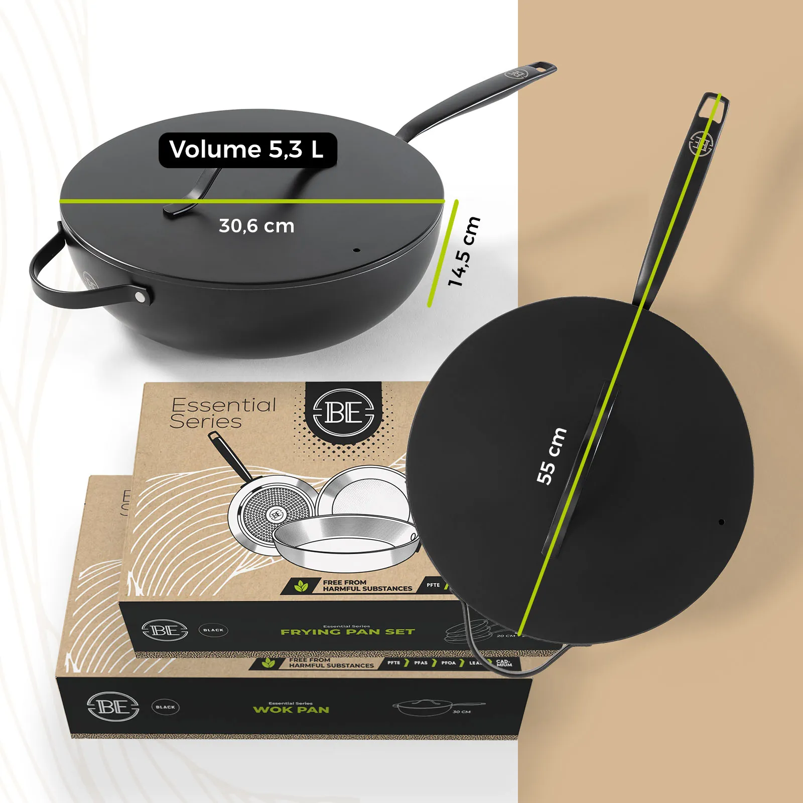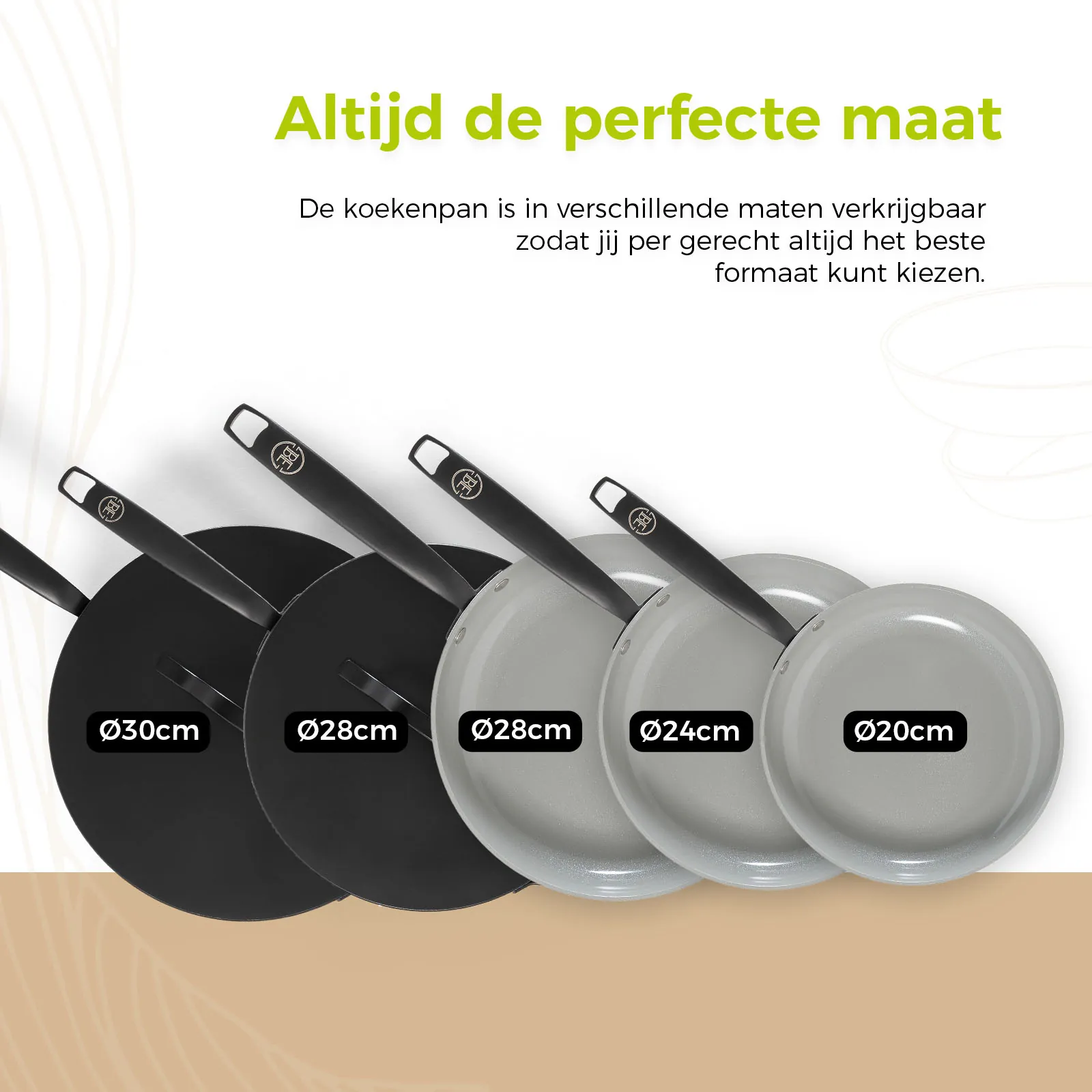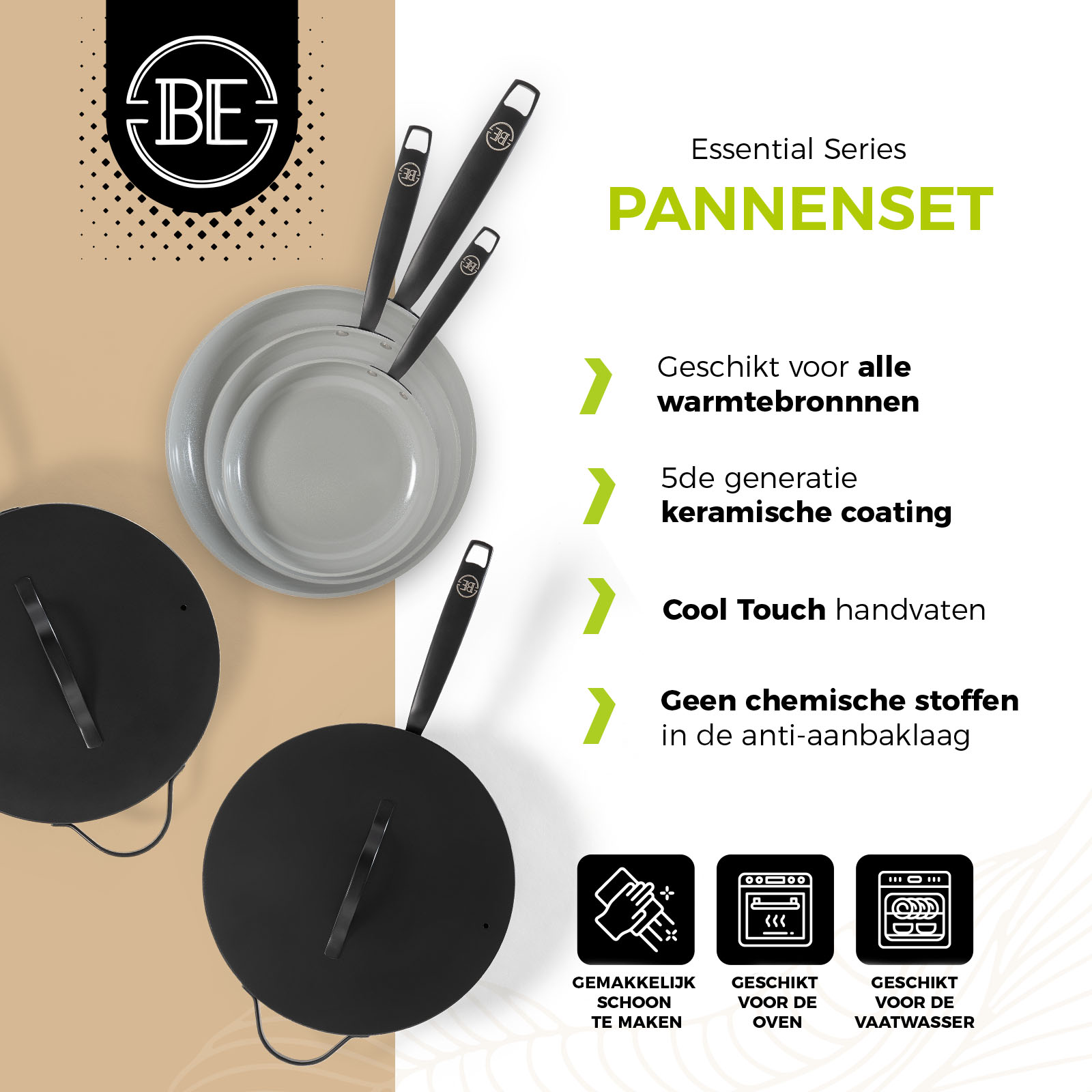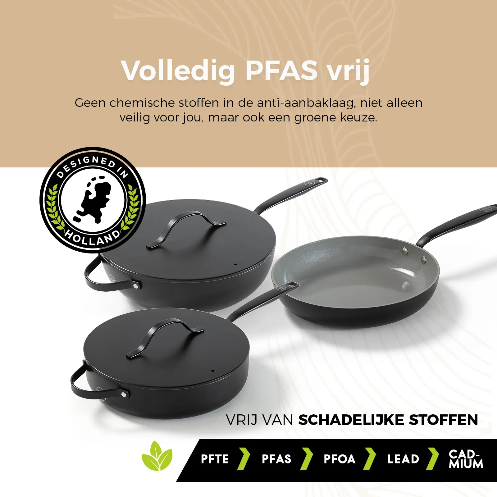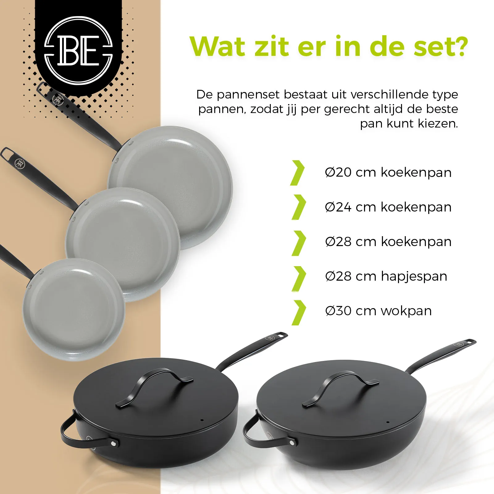 BE Living presenteert een pannenset met koekenpannen van Ø 20, 24 en 28 cm + een wokpan van Ø 30 cm en een hapjespan van Ø28 cm, perfect voor alle warmtebronnen inclusief inductie én vrij van PFAS. Een essentiële aanwinst voor iedere moderne keuken.