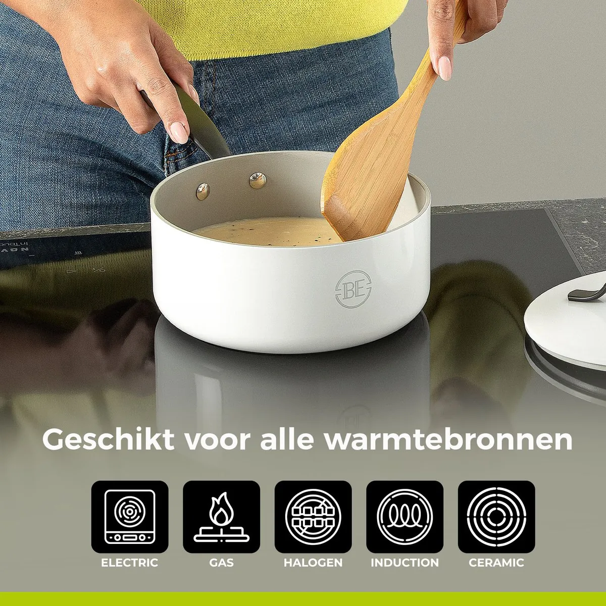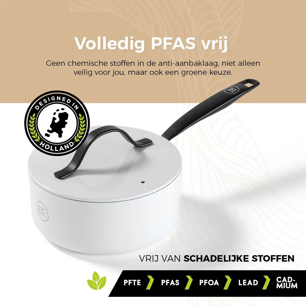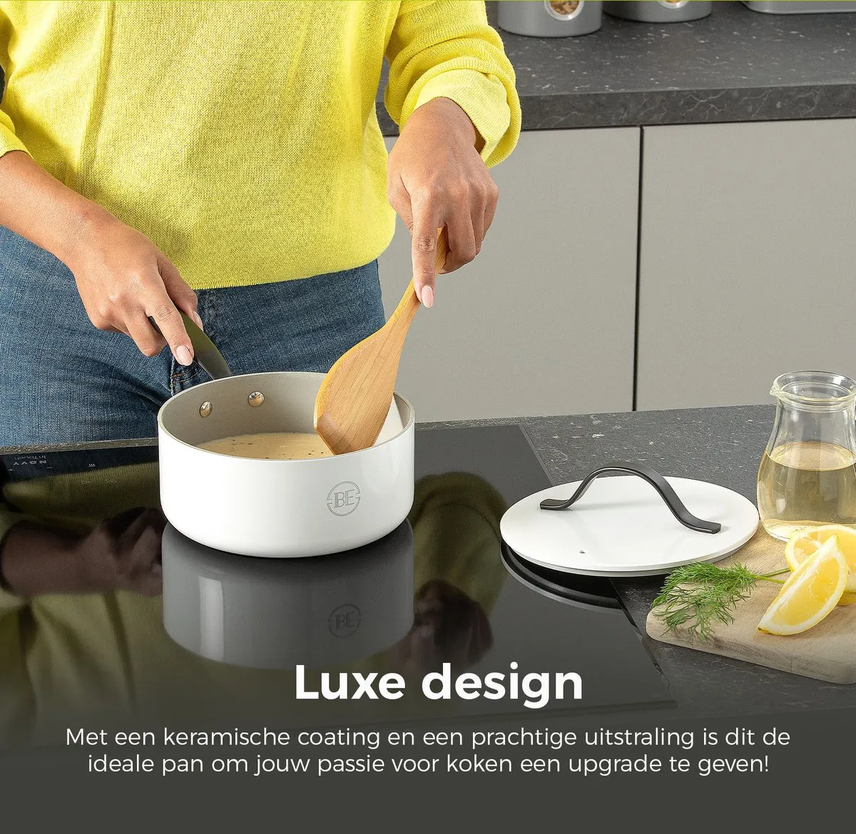 BE Living presenteert een 18 cm witte sauspan, perfect voor alle warmtebronnen inclusief inductie én vrij van PFAS. Een essentiële aanwinst voor iedere moderne keuken.