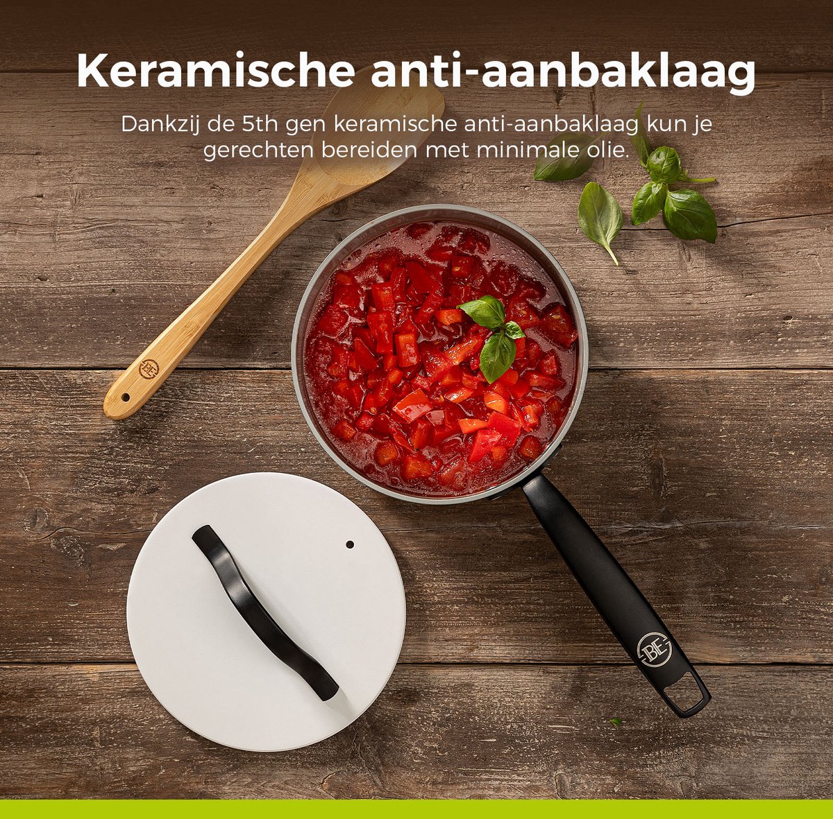 De pannen van BE Living zijn volledig vrij van PFAS, wat betekent dat je met een gerust hart kunt koken zonder schadelijke chemicaliën die in sommige anti-aanbaklagen worden aangetroffen. Dit maakt ze niet alleen veilig voor jou, maar ook een groene keuze.