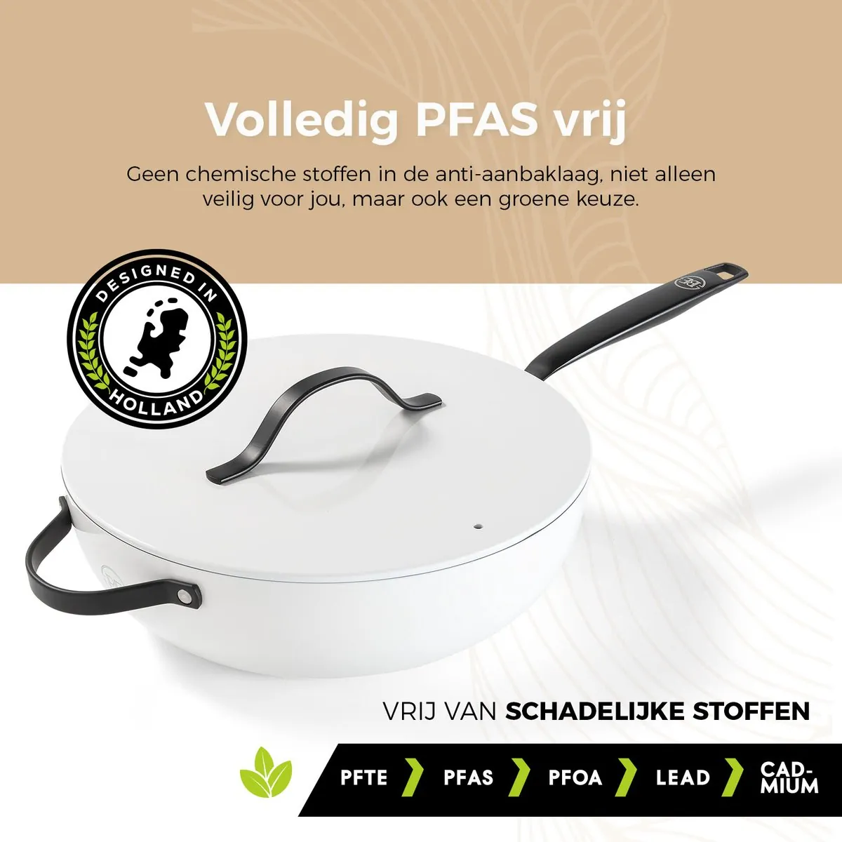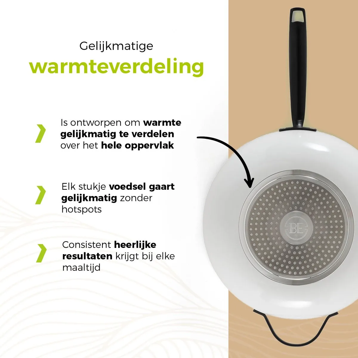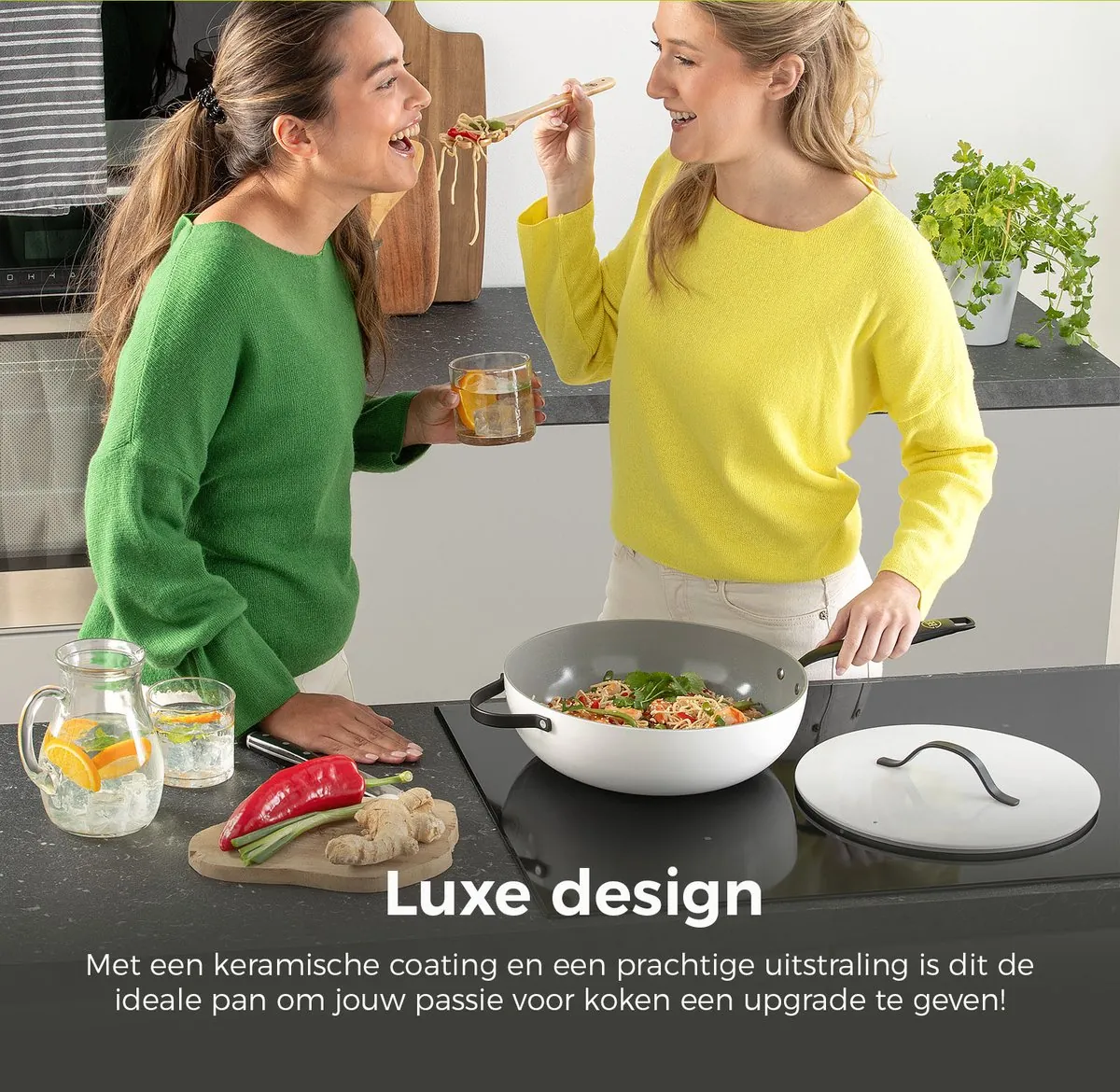 BE Living presenteert een 30 cm witte wokpan, perfect voor alle warmtebronnen inclusief inductie én vrij van PFAS. Een essentiële aanwinst voor iedere moderne keuken.