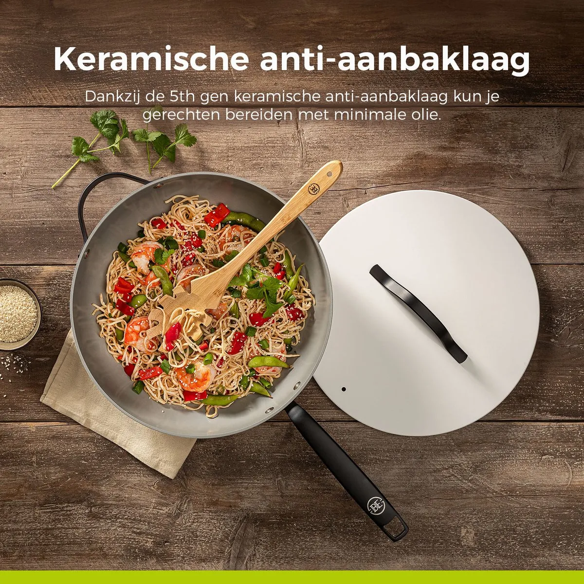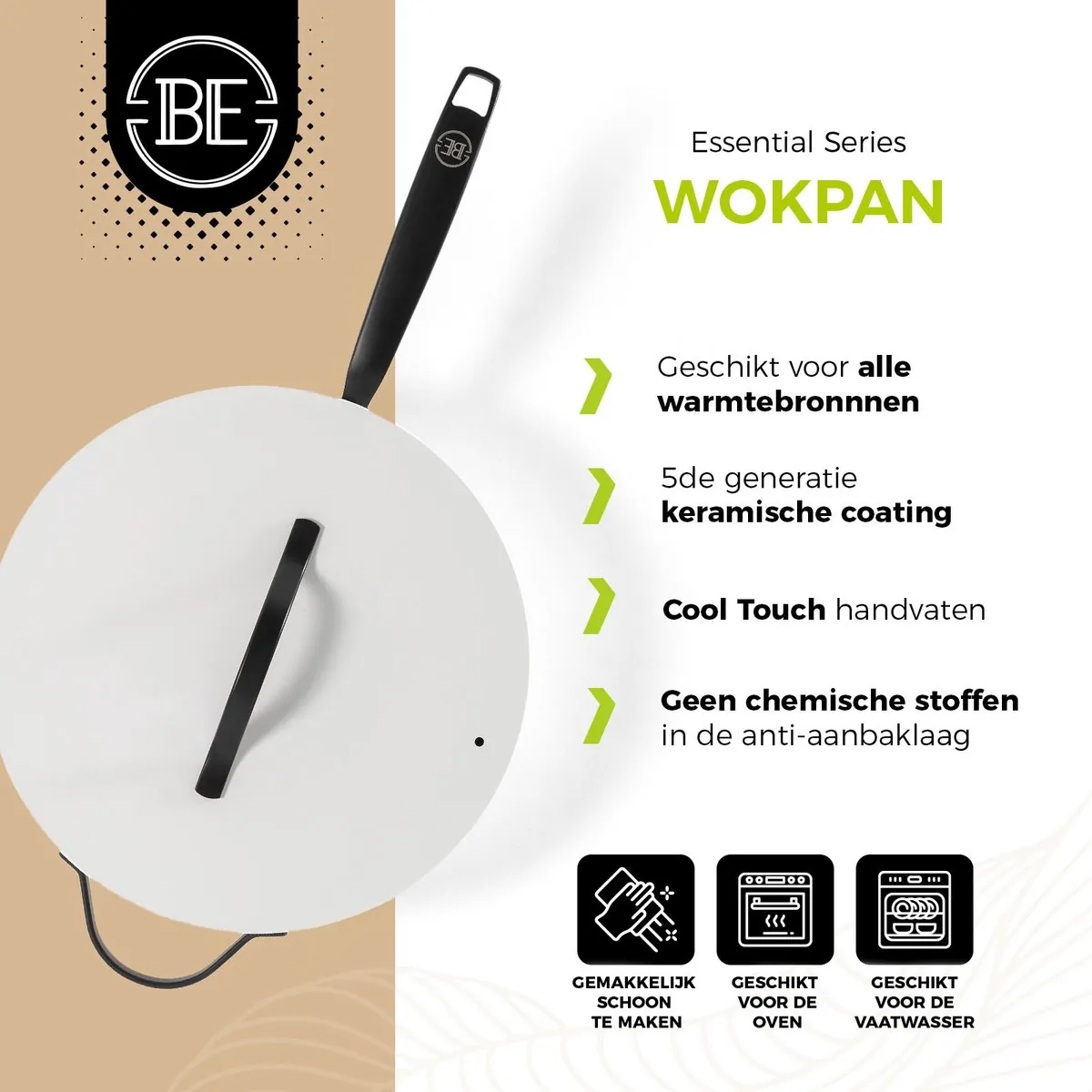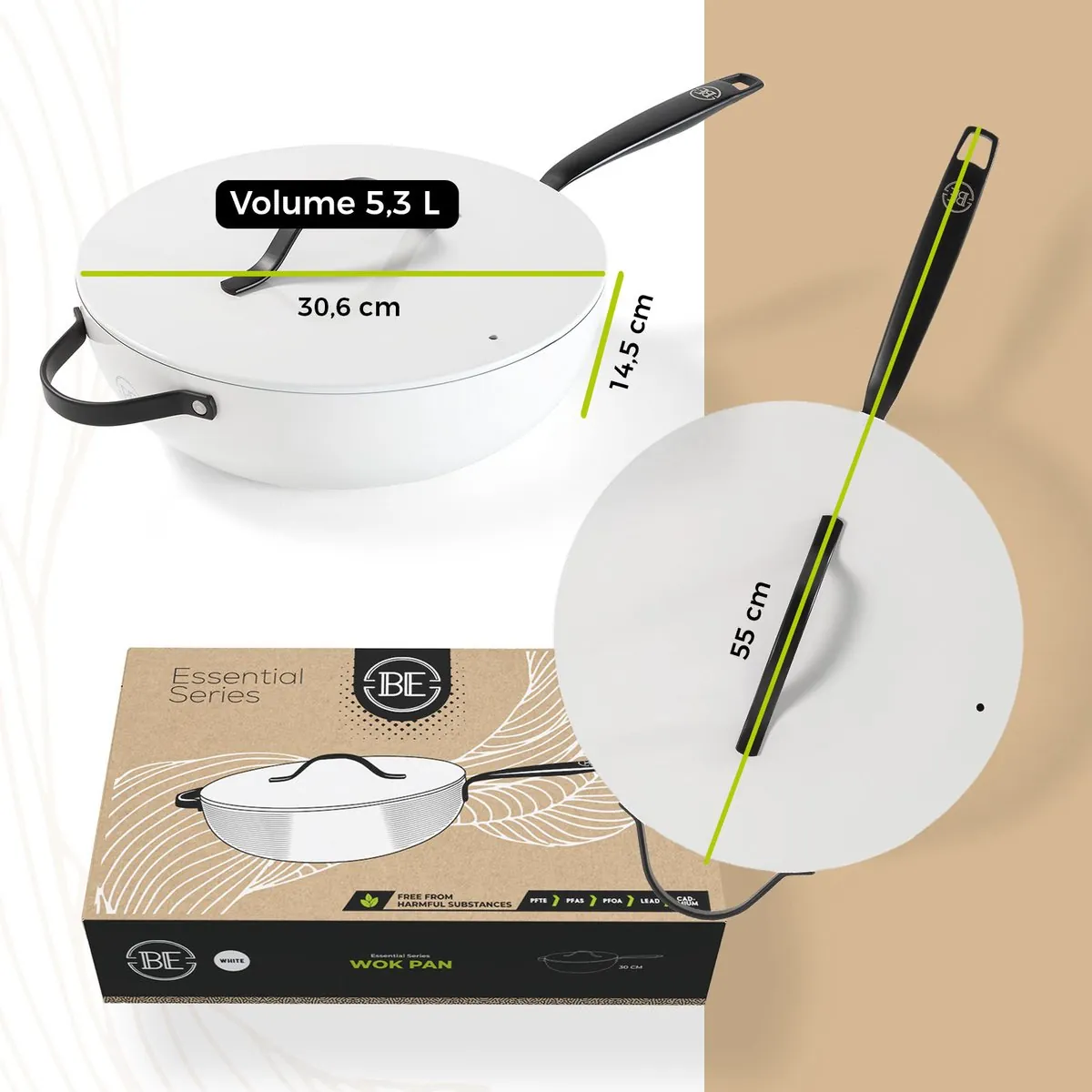 BE Living presenteert een 30 cm witte wokpan, perfect voor alle warmtebronnen inclusief inductie én vrij van PFAS. Een essentiële aanwinst voor iedere moderne keuken.