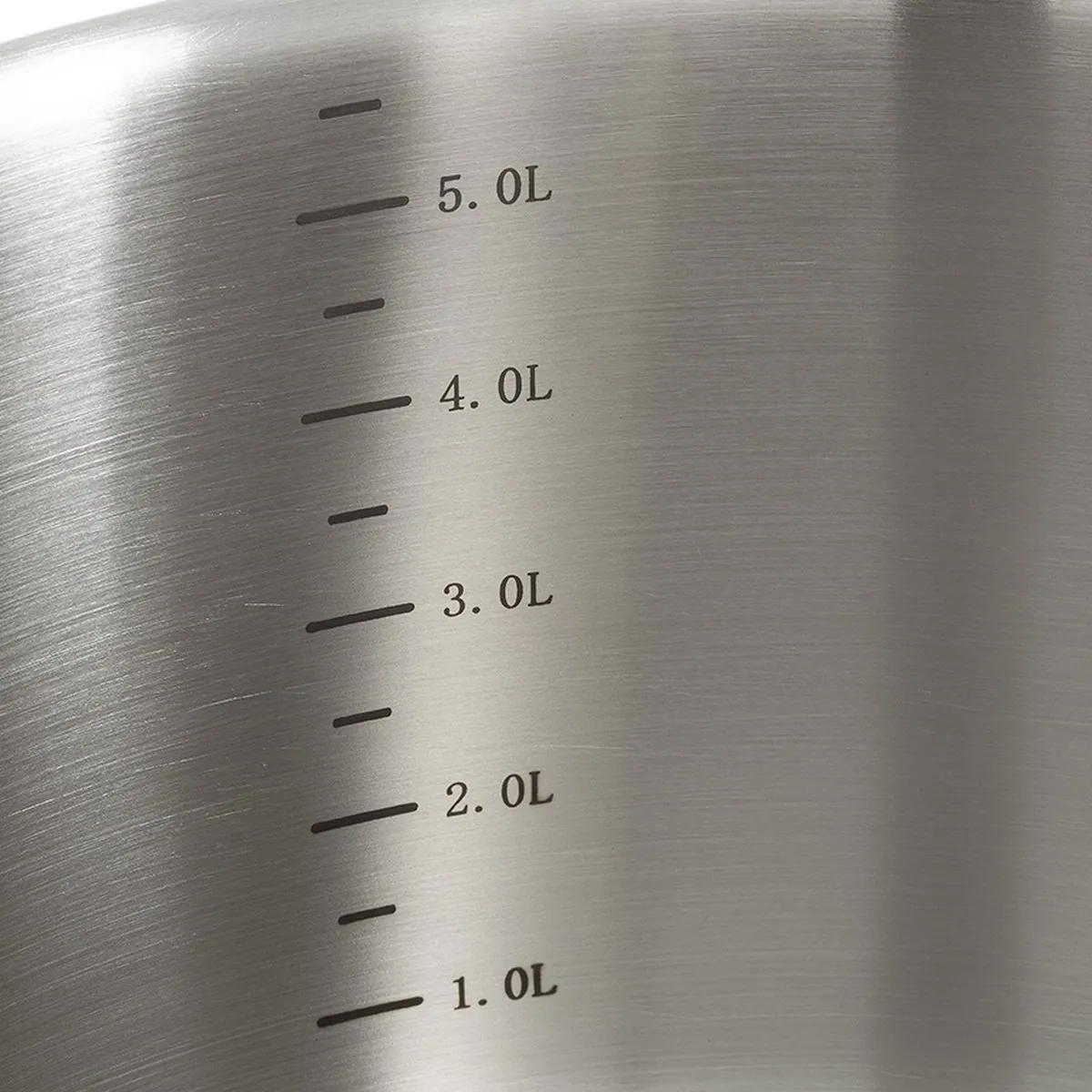Met een handige maatverdeling aan de binnenkant van de kookpan kun je eenvoudig ingrediënten afmeten tijdens het koken. Dit bespaart tijd en vermindert de noodzaak van extra meetgerei, waardoor koken efficiënter en nauwkeuriger wordt.