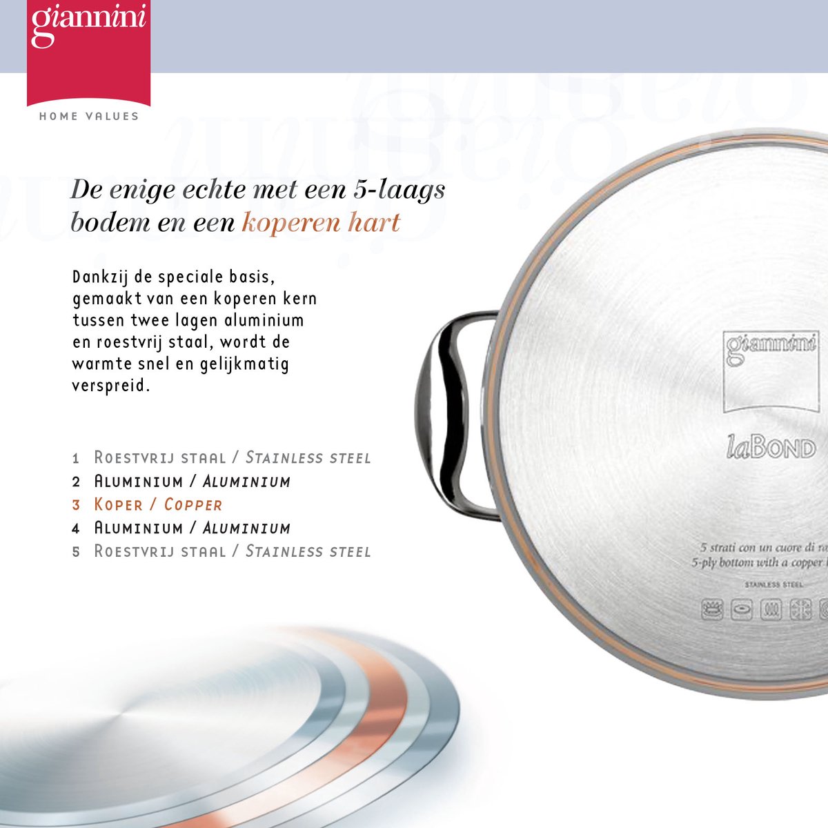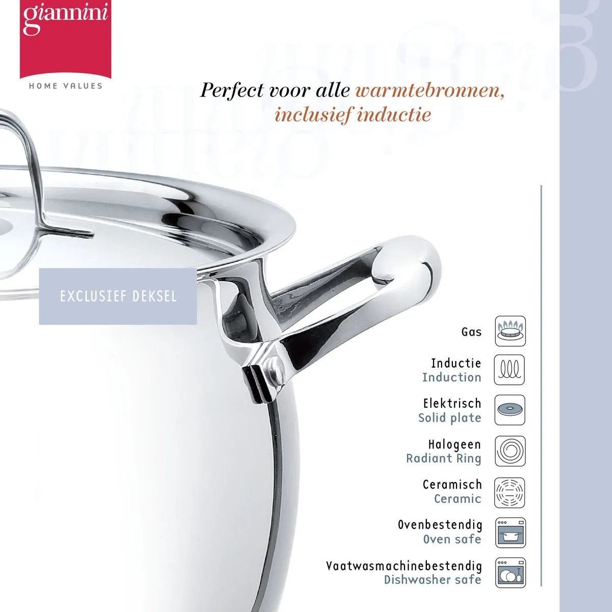 De pannen van Giannini LaBond zijn compatibel met alle warmtebronnen. Dit maakt de pannen uiterst veelzijdig en perfect voor elke keuken, zodat je moeiteloos kunt schakelen tussen verschillende kookmethodes zonder extra kookgerei nodig te hebben.