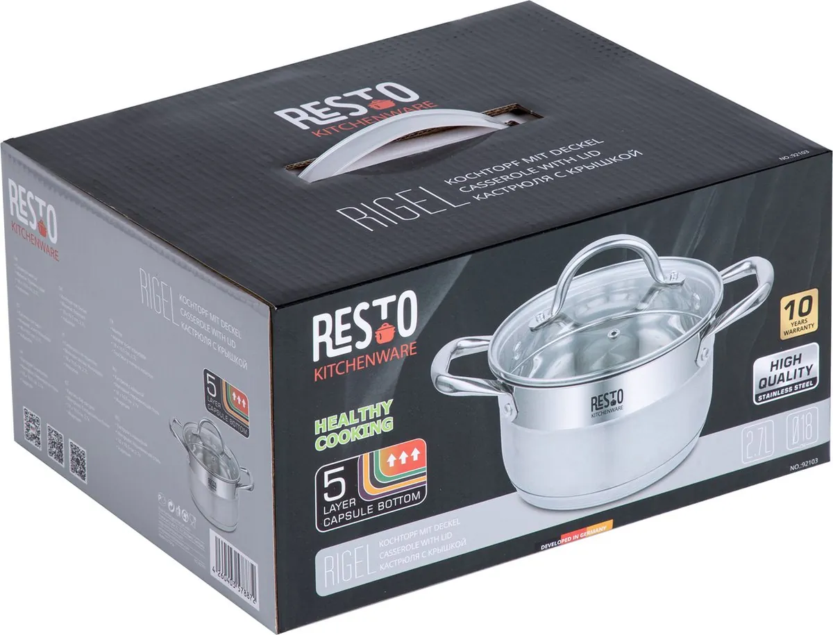 Aan de praktische elementen is zeker gedacht. Waar we vroeger op zoek moesten naar doeken om de pan te verplaatsen, is dit met de innovatieve materialen van tegenwoordig verleden tijd. Daarom heeft Resto een pan ontwikkelt met hittebestendige handvaten en een hittebestendige glazen deksel. Nu hoeft u niet meer bang te zijn om uw vingers te verbranden en kunt u makkelijk uw pan over het fornuis verplaatsen.