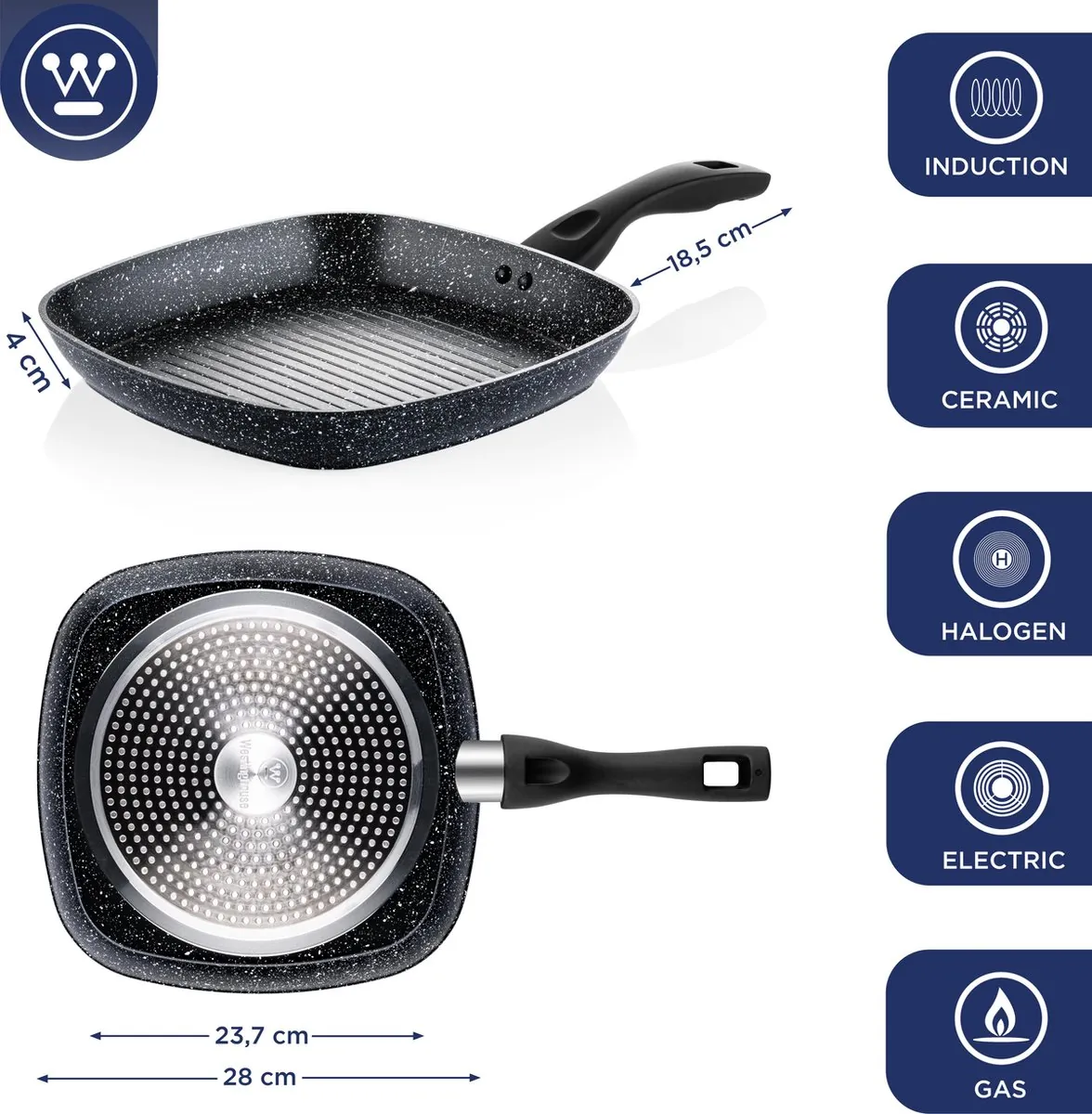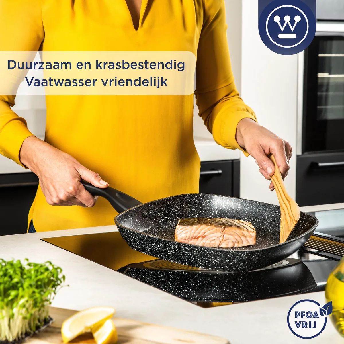 De Westinghouse Zwart Marmer Grillpan (28cm) zorgt voor een mooie grillstuctuur dankzij de ribbels in de pan. Zo kan je net zo grillen als op de BBQ, in de winter en de zomer. Door de snelle opwarming en gelijkmatige warmteverdeling kan je vlees snel dichtschroeien, waardoor het vanbinnen lekker sappig blijft. De Westinghouse Grillpan 28cm is niet alleen uitermate geschikt voor vlees zoals biefstuk, ribeye of tournedos, maar ook voor kipfilet, zalm en gegrilde groenten zoals courgette, aubergine en paprika. Dankzij de ribbels in de pan komt het gerecht niet rechtstreeks in aanraking met het vet of de olie, wat het meteen ook gezonder maakt. Ook een lekkere tip is om een heerlijke flatbread te bereiden in deze grillpan. Kortom, de onmisbare pan voor jouw keuken!