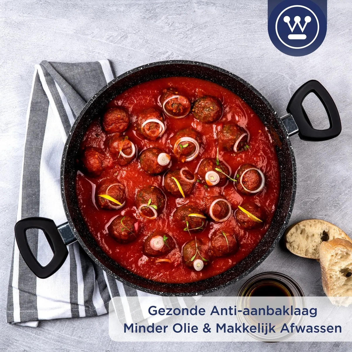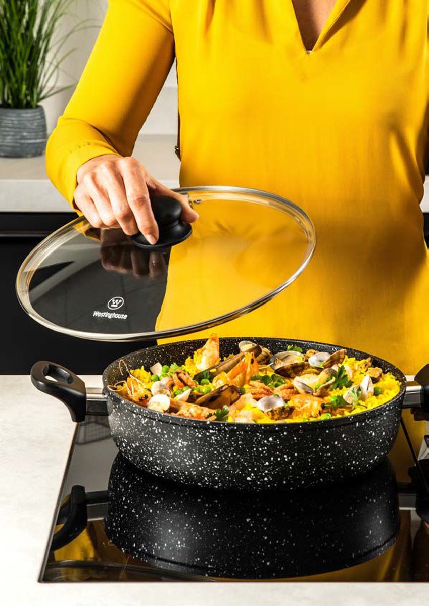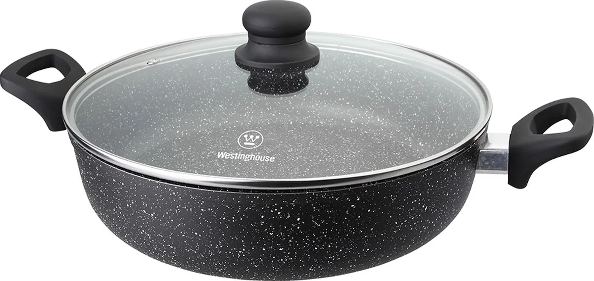 De Westinghouse Zwart Marmer Hapjespan 32cm mag niet ontbreken aan jouw pannencollectie. De hapjespan is ideaal voor het bereiden van bijvoorbeeld eenpansgerechten, een lekkere risotto, paella of een heerlijke pastasaus. De pan is gemaakt uit aluminium en licht in gewicht. Zo verplaats je de hapjespan gemakkelijk van de warmtebron rechtstreeks naar de tafel.