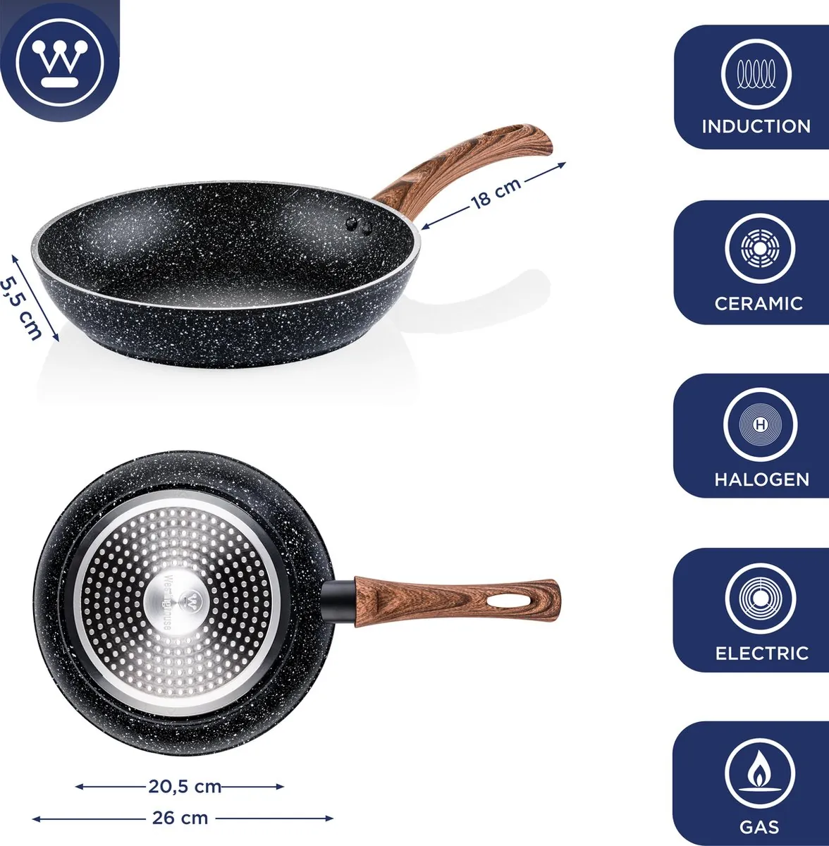 Met de Westinghouse Zwart Marmer Koekenpan Speciale Editie (26cm) haal je een mooie basis pan in huis. De uiterst sterke anti-aanbaklaag maakt dat je stukje vis of gebakken groentjes niet vastplakken, zelfs met weinig vetstof. De pan is gemaakt uit aluminium wat zorgt voor een snelle opwarming en gelijkmatige warmteverdeling. Zo bak je de aardappeltjes altijd mooi egaal bruin.