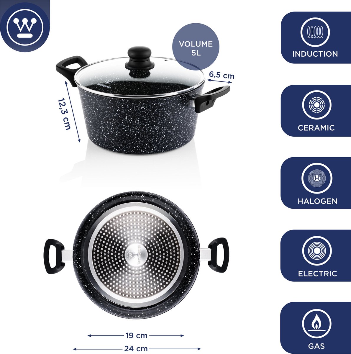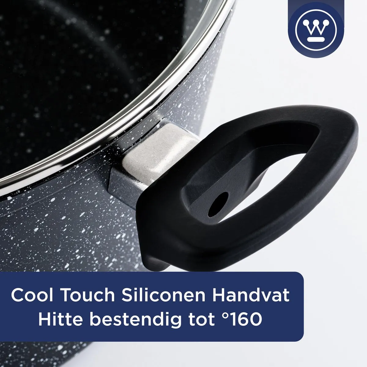 Met de Westinghouse Zwart Marmer Kookpan 24cm haal je een ideale kookpan in huis om de heerlijkste gerechten te bakken, stoven en braden. De braadpan is voorzien van een duurzame anti-aanbaklaag. Door de snelle opwarming en gelijkmatige warmteverdeling bereid je makkelijk en snel je favoriete gerechten, ook voor een groot gezelschap.