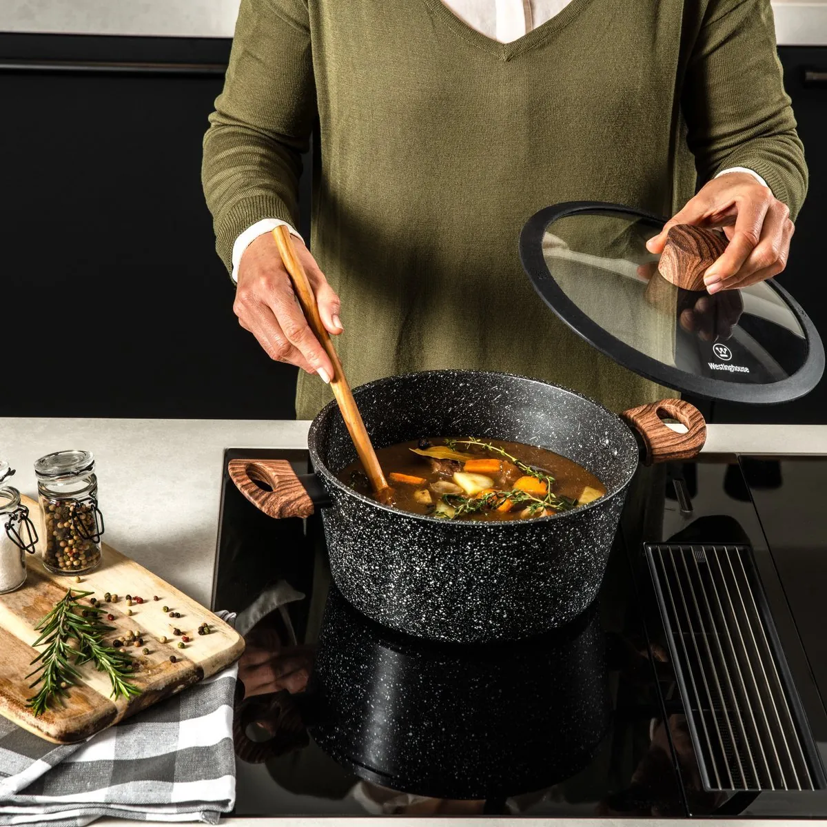 Met deze pannenset, die geschikt is voor alle warmtebronnen inclusief inductie, heb jij de basis van je keuken in huis. Aardappels, groente, pasta, rijst en soep, je bereid het allemaal in deze kookpannen van Westinghouse. De Black Marble Wood pannen zijn daarnaast een echte eye-catcher in jouw keuken en maken het interieur helemaal af.