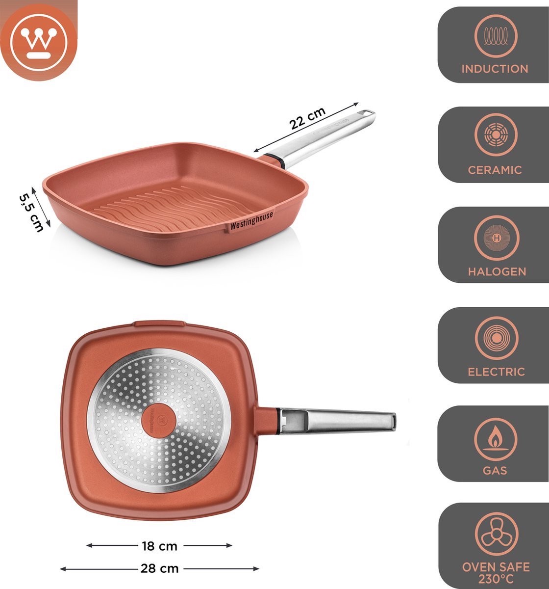 Deze pannenset bevat 1 Westinghouse Performance Series Wokpan 28cm en 1 Grillpan 28cm. De Performance pannenbundels zijn verkrijgbaar in vier verschillende kleuren: Blauw, Groen, Rood en Zwart.