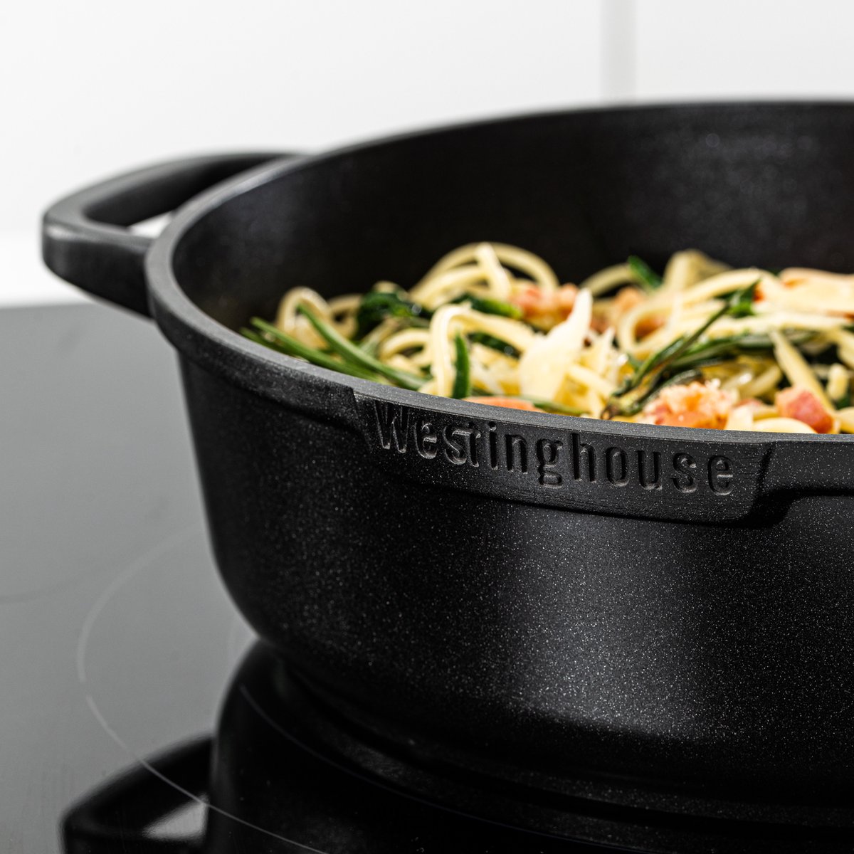 Deze Westinghouse pannenset Performance Series bevat Braadpan 24cm/28cm + Hapjespan 32cm + Wokpan 28cm + Koekenpan 24cm/28cm + Grillpan 28cm + Steelpan 18cm in het zwart.