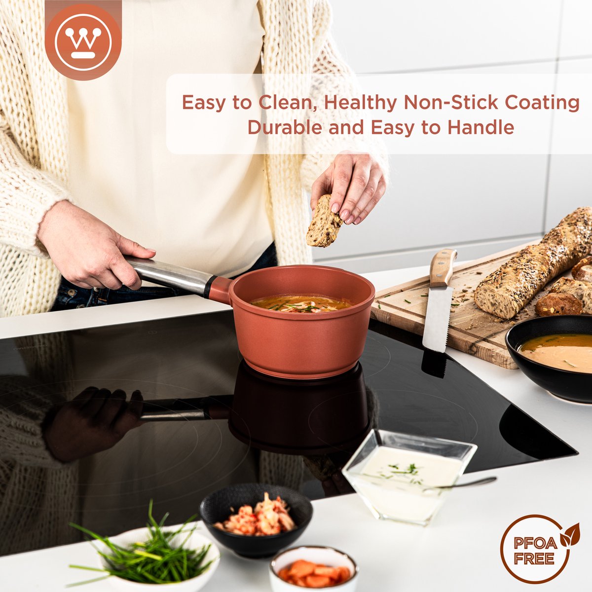 Alle pannen (koekenpannen, kookpannen, hapjespannen, wokpannen, grillpannen en steelpannen) en pannensets van de Westinghouse Performance Series Cookware hebben een PFOA-vrije anti-aanbaklaag dat geen gifstoffen bevat. Tevens komen er geen schadelijke stoffen vrij tijdens het koken dankzij de speciale QuanTanium coating. Gegarandeerd veilig en smakelijk koken dus!