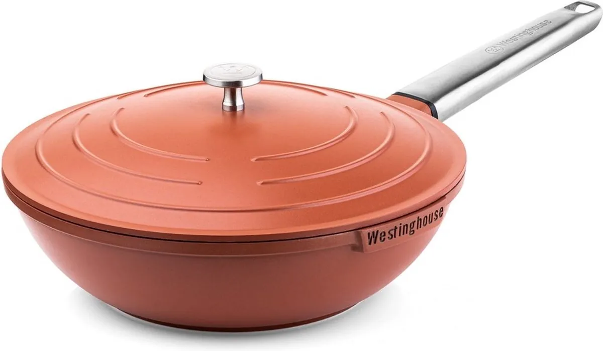 Deze wokpan van Westinghouse maakt deel uit van de Performance Series Cookware en is ideaal als kippenbraadpan, mosselkoker, rijstkoker, groentenbraadpan, fonduepan en soeppan dankzij de inventieve spikes onderaan het deksel. Deze spikes in de wokpan zorgen ervoor dat condens blijft hangen en zich tot druppels vormen. Het vocht valt vervolgens op het eten, waardoor de ingrediënten sappig blijven en jouw gerecht smaakvoller dan ooit tevoren is! Dé oplossing voor het voorkomen van uitgedroogd eten. Ook handig: deze Westinghouse wokpan heeft roestvrijstalen cool-touch handgrepen en handvaten.